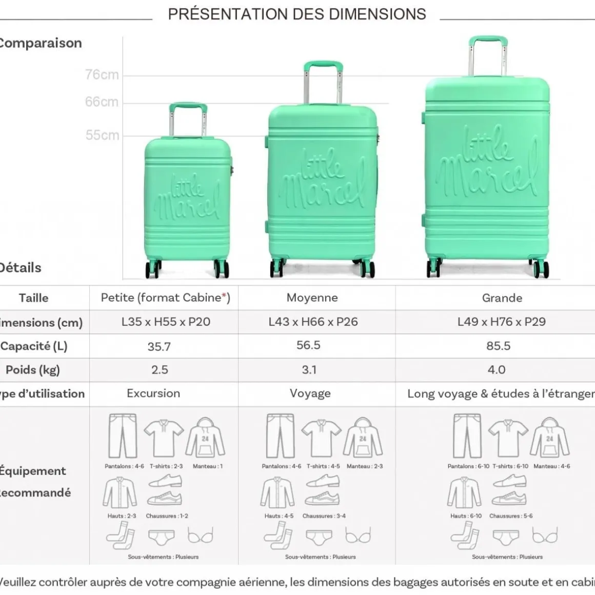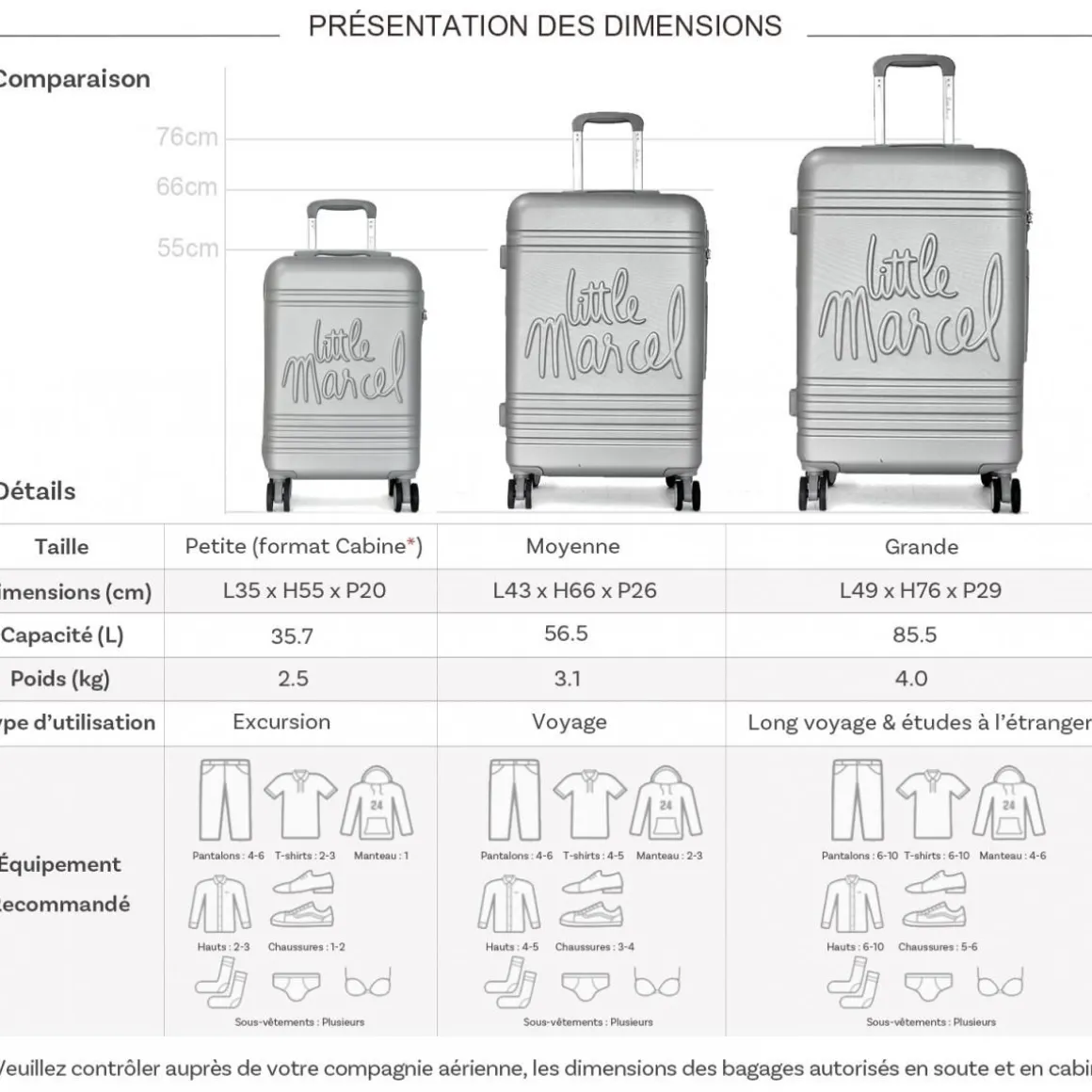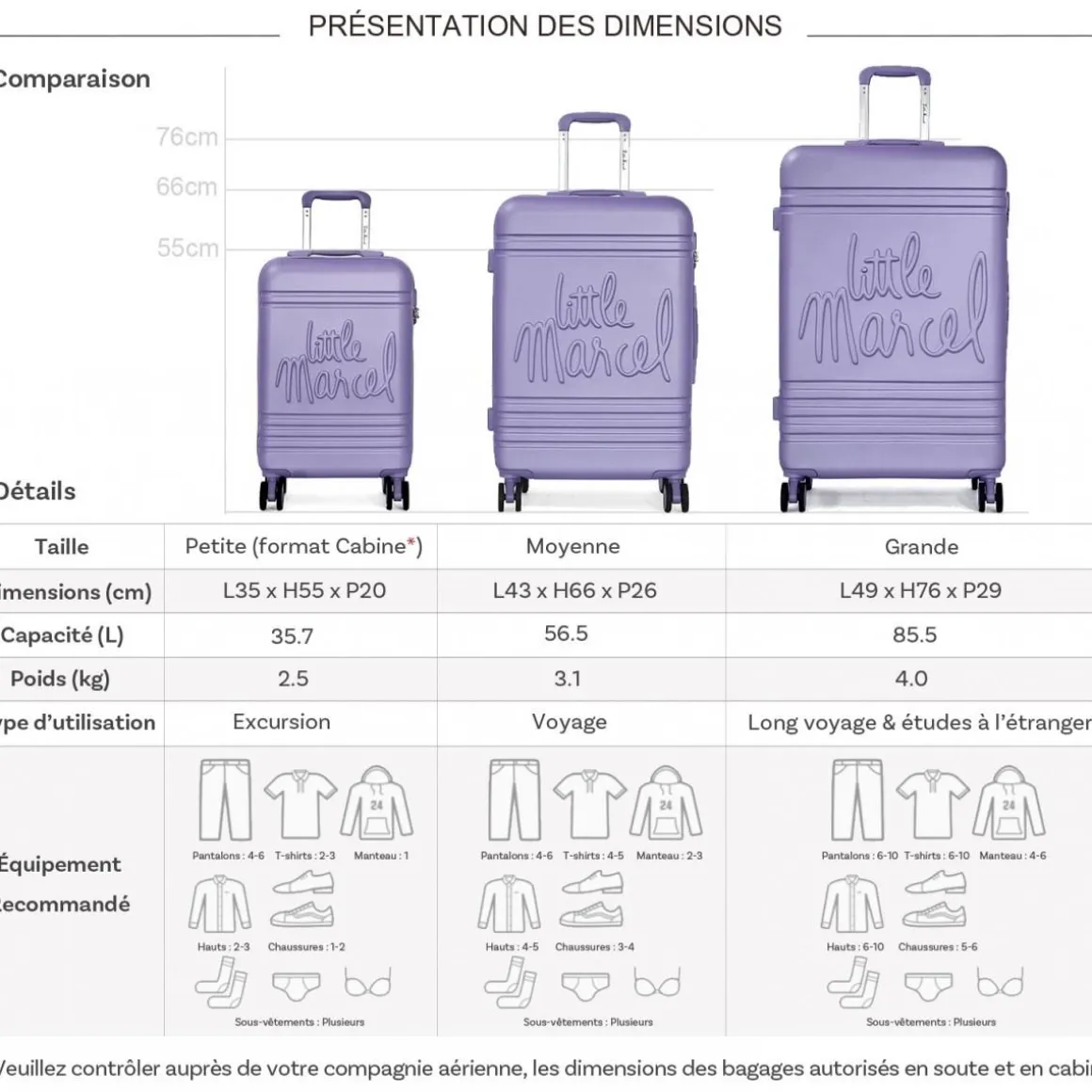 Les dimensions indiquées sont les dimensions extérieures des bagages, comprenant poignées, roulettes, pieds, poches latérales et autres éléments extérieurs.