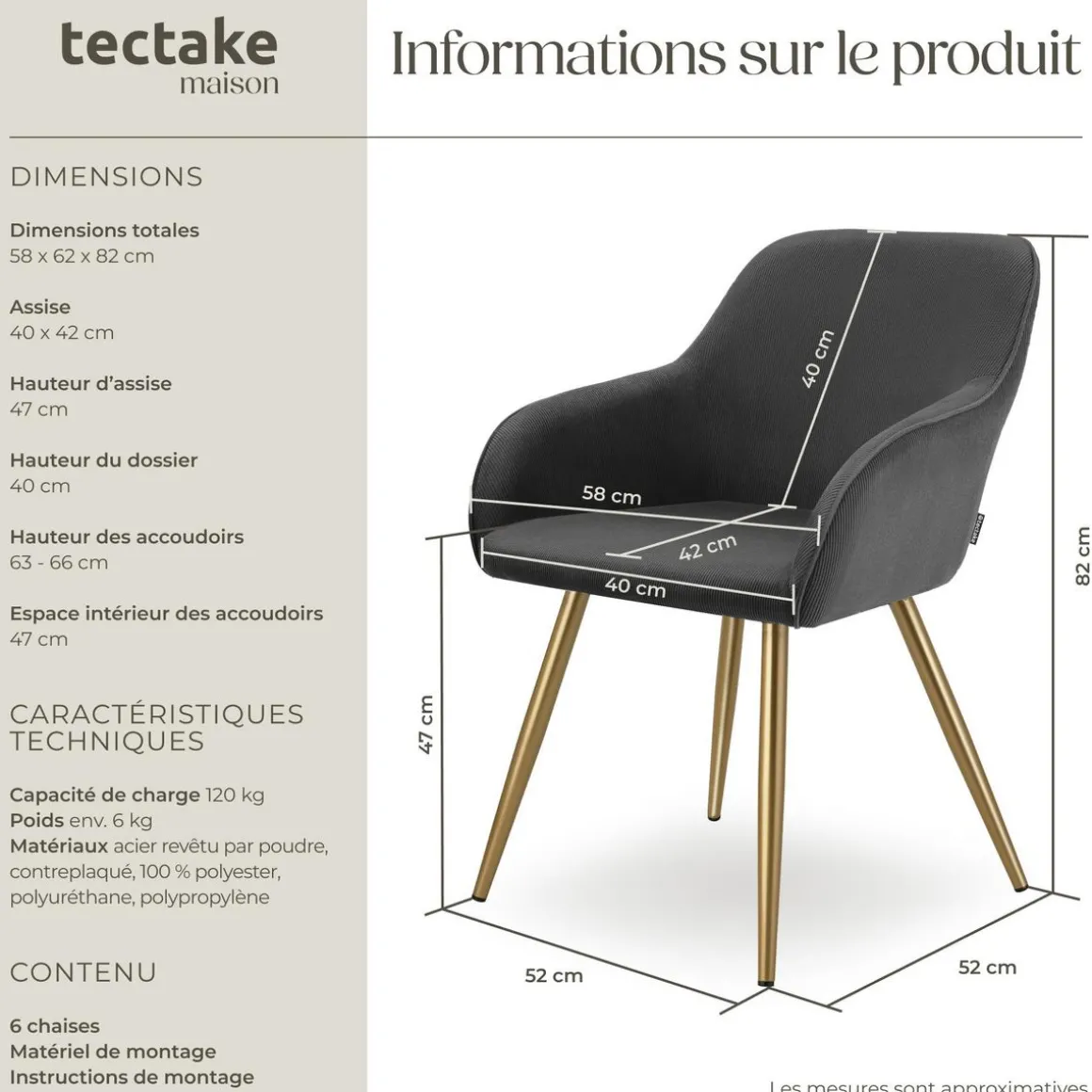 Apportez une touche spéciale à votre maison avec le lot de 6 chaises Marilyn avec revêtement en velours côtelé de tectake. Ces élégantes chaises de salle à manger combinent un design moderne avec une expérience d’assise incomparable.