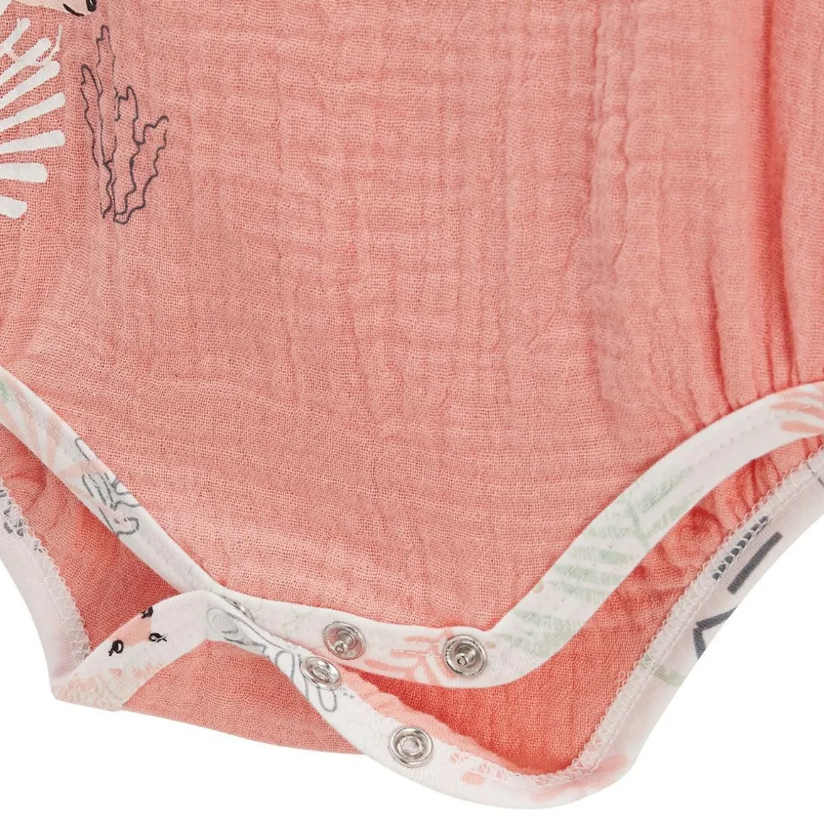 Quoi de mieux qu’une belle couleur pêche pour l’été ? Optez pour ce lot de bodies bloomers sans manches pour passer un été confortable. On adore ses jolis motifs et sa douce matière en gaze de coton. Produit labellisé STANDARD 100 by OEKO-TEX ®(BJ020 189402 TESTEX) En gaze de coton toute douce Forme effet bloomer Ouverture par pressions à l’entrejambe