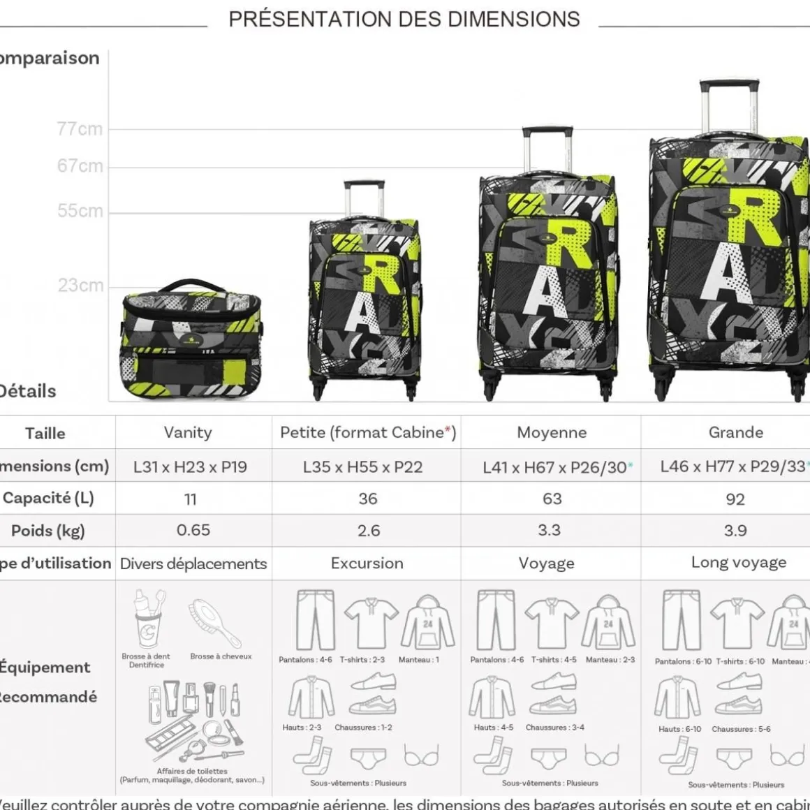 Les dimensions indiquées sont les dimensions extérieures des bagages, comprenant poignées, roulettes, pieds, poches latérales et autres éléments extérieurs.