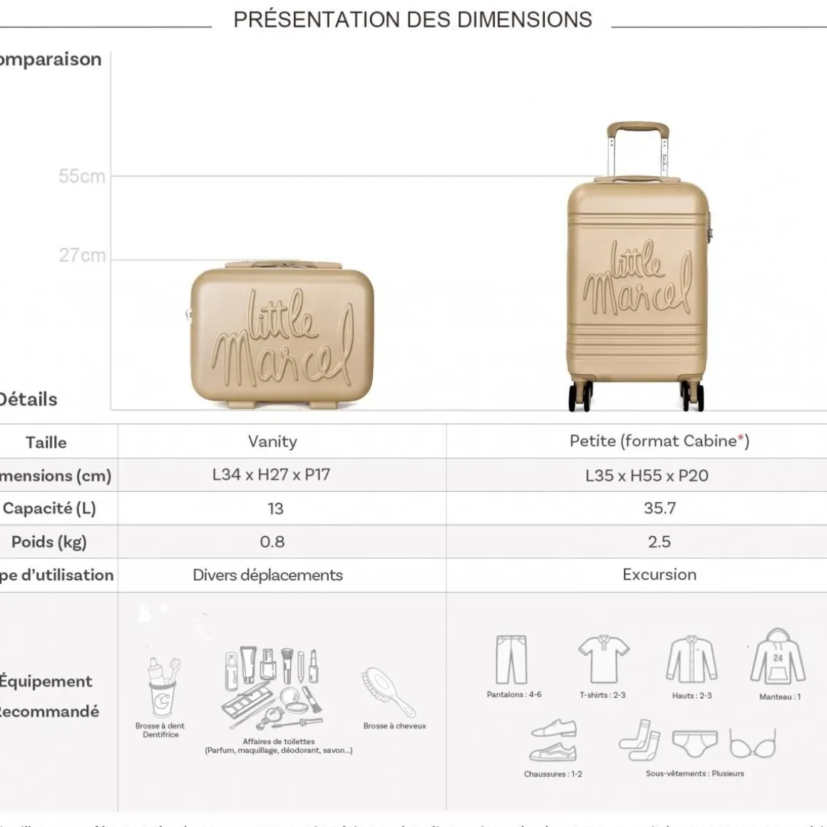 Les dimensions indiquées sont les dimensions extérieures des bagages, comprenant poignées, roulettes, pieds, poches latérales et autres éléments extérieurs.