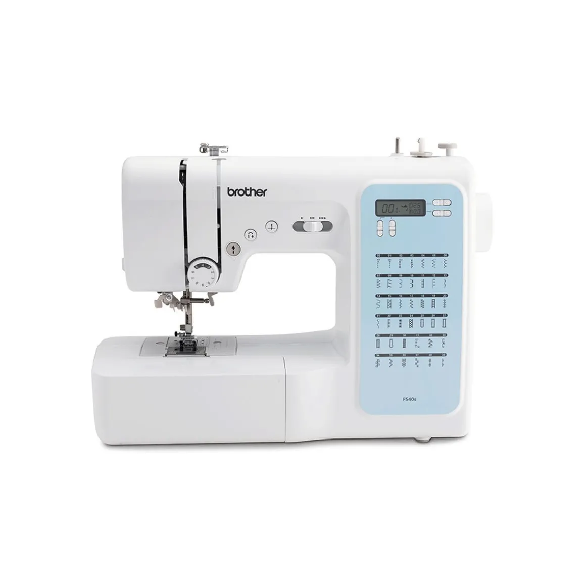 Pratiquez la couture avec la machine à coudre électronique FS40S de Brother. Elle est dotée de 5 boutonnières en 1 étape, 40 points, d’une longueur et d’une largeur des points réglables et d’un variateur de vitesse. La tension du fil est également réglable.