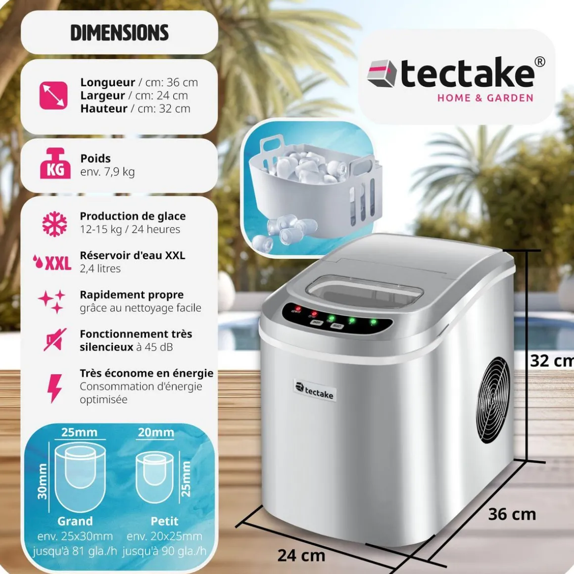 - 1 machine à glaçons, panier à glace et pelle à glaçons incl.