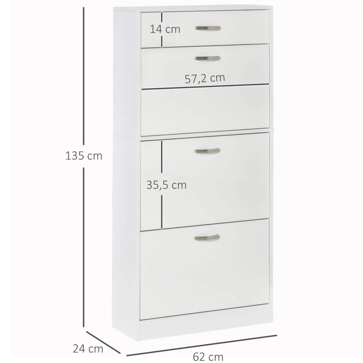 – Meuble à chaussures grande taille doté de 3 portes abattantes à 2 niveaux de rangement (réglable en hauteur) et d’un tiroir coulissant
