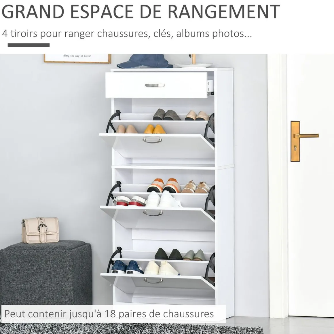 – Capacité de rangement : jusqu’à 18 paires de chaussures selon les pointures et modèles