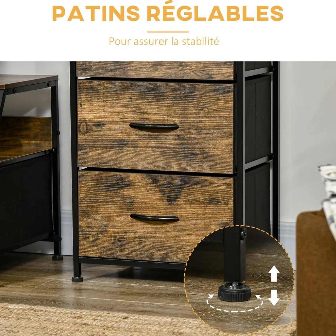 – Excellent niveau de finition : meuble sur pied, poignées assorties noir, tiroirs pliables, pieds de nivellement réglables antidérapants, dispositif arrière anti-basculement
