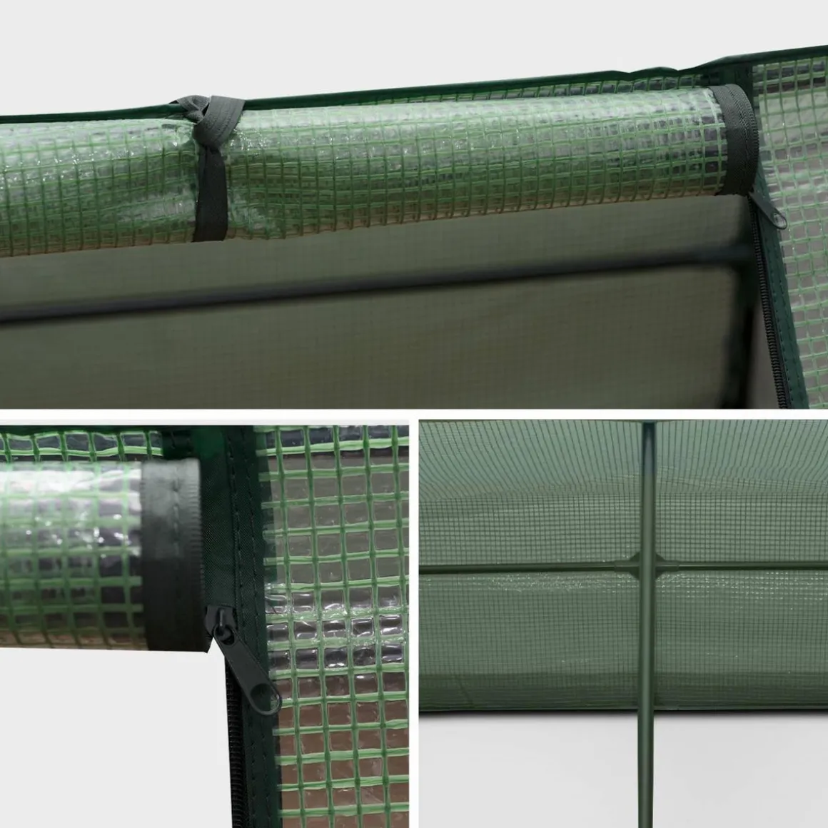 L’,aération est importante pour les plantes, la serre est donc équipée d’,une grande fenêtre pour réguler sa température. La serre a une toile en polyéthylène de 135g/m2 souple et résistant. Les parois ont un débord de film à enfouir sous la terre pour maintenir la serre. La structure est en acier recouvert de peinture époxy qui retarde l’,apparition des traces de corrosion.