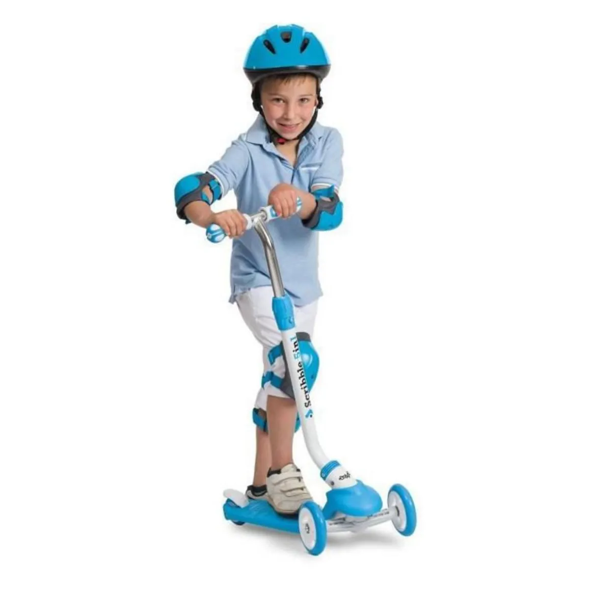 Trottinette On and Go Scribble 5 en 1 – 3 roues évolutives 5 en 1 – Systeme de pliage – Cadre en acier solide et durable – Tube alu léger et maniable – Deck PP antidérapant – Poignées TPR antidérapantes – Roulements ABEC-5 – Frein arriere – Canne et guidon réglable en 3 positions – Coloris : bleu – Livré a l’unité.