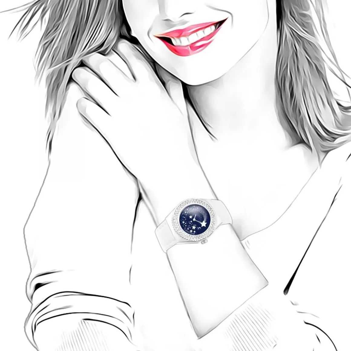 Cette luxueuse et romantique montre Alysson étoiles à mouvement tournant est issue de notre ingéniosité dans le monde du design des bijoux. Elle est dotée d’un boîtier de conception altique en acier inoxydable. Une lunette bleue polie encadre un cadran orné d’étincelants 87 Cristaux scintillants, complétée par un mouvement des secondes en forme d’étoiles brillantes tournant autour du cadran. Ce joli mouvement des étoiles blanches dans le fond bleu de la lunette, accompagné d’un bracelet en cuir blanc rehausse l’éclat et l’élégance de votre beauté et attire des regards vers votre look au quotidien.