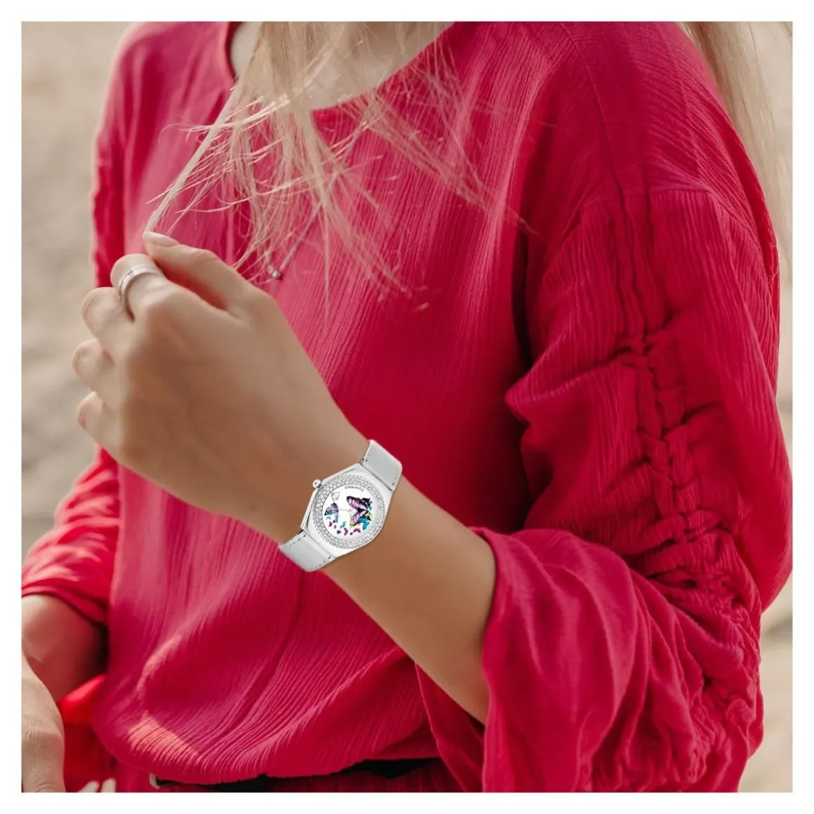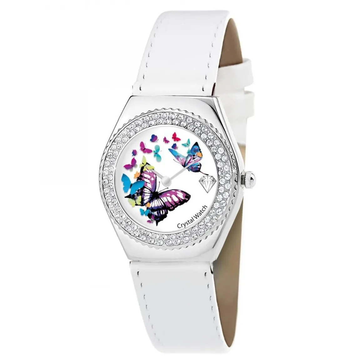 Avec un design audacieux et un éclat fabuleux, la montre Alysson papillon à mouvement tournant est une merveilleuse création qui vous confère une allure de pure élégance. Magnifiée d’un cadran orné en dents de scie merveilleusement expressif, un boîtier en acier inoxydable, un bracelet en cuir blanc en forme de papillons multicolores tournant autour du cadran complètent ce design unique. Magnifiquement modelé, ce design ultra féminisé est agrémenté d’une lunette recouverte d’un micro-pavé de 87 Cristaux scintillants brillants et d’un mouvement Quartz haute fiabilité.