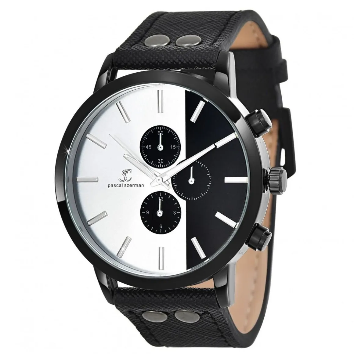 Epurée, luxueuse et pratique à la fois, cette montre quartz homme par Pascal Szerman évoque un tempérament magnétique et inoubliable. Associant avec glamour un boîtier en acier inoxydable et un bracelet noir en cuir véritable, cette montre chronographe sophistiquée dégage une allure à la fois intemporelle et audacieuse. Sans aucun doute, elle apportera de l’assurance à votre style. Le cadran bicolore blanc-noir est couvert d’une lunette en verre minéral et agrémenté d’un mouvement Quartz haute fiabilité pour magnifier votre poignet. Fabriqué en laiton, avec une plaquage haute résistance, elle est intemporelle.