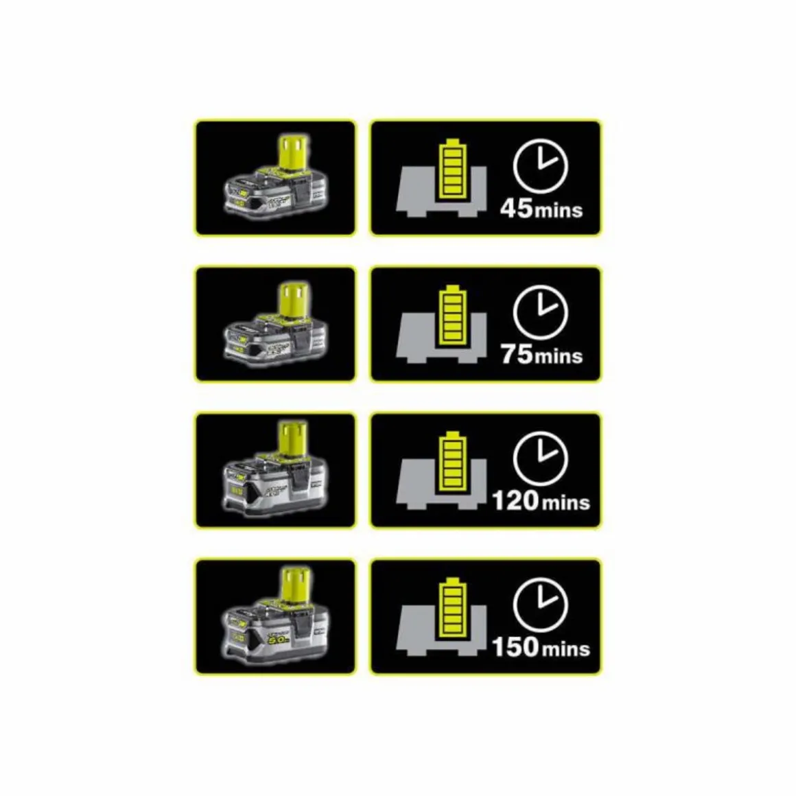 Cepack RYOBIest composé de deux batteries 5,0Ah et d’un chargeur rapide. Ces accessoires sont compatibles avec tous les outils jardin et bricolage de la gamme 18V One+. Les batteries possèdent la technologie Lithium+IntelliCell et vous garantissent d’avoir un haut niveau d’autonomie en cas de travail continu ou intensif. À titre d’exemple, elles affichent une autonomie supérieure à 25% par rapport aux batteries 4,0Ah. Vous pourrez avoir un oeil sur le niveau de charge grâce à 4 indicateurs (25% chacun) et même lorsque la décharge totale est proche, votre outil continuera de fonctionner à plein régime. Pour une meilleure durée de vie, les batteries sont dotées d’une protection électronique contre la surcharge et la surchauffe.