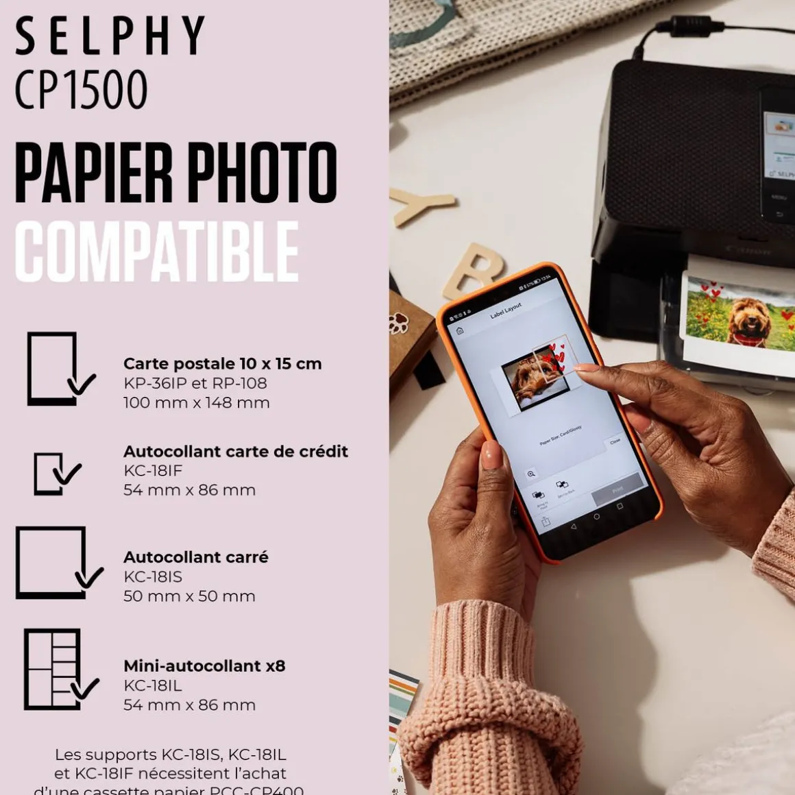 Grâce à la connexion Wi-fi depuis votre smartphone à l’aide de l’application SELPHY Photo Layout, vous pourrez imprimer en toute simplicité et personnaliser vos impressions avec des filtres, des motifs….