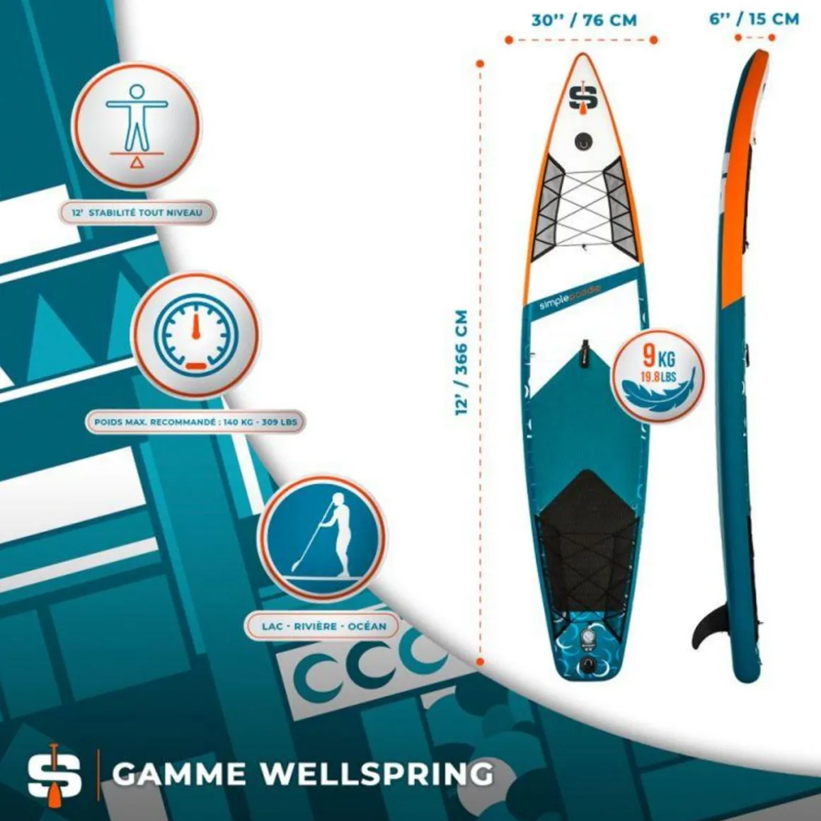 La construction en Dropstitch et le PVC apportent solidité et une grande résistance aux chocs. Il se gonfle en quelques minutes (6 à 9 minutes) avec une pompe manuelle et se transporte facilement avec les accessoires dans un sac.