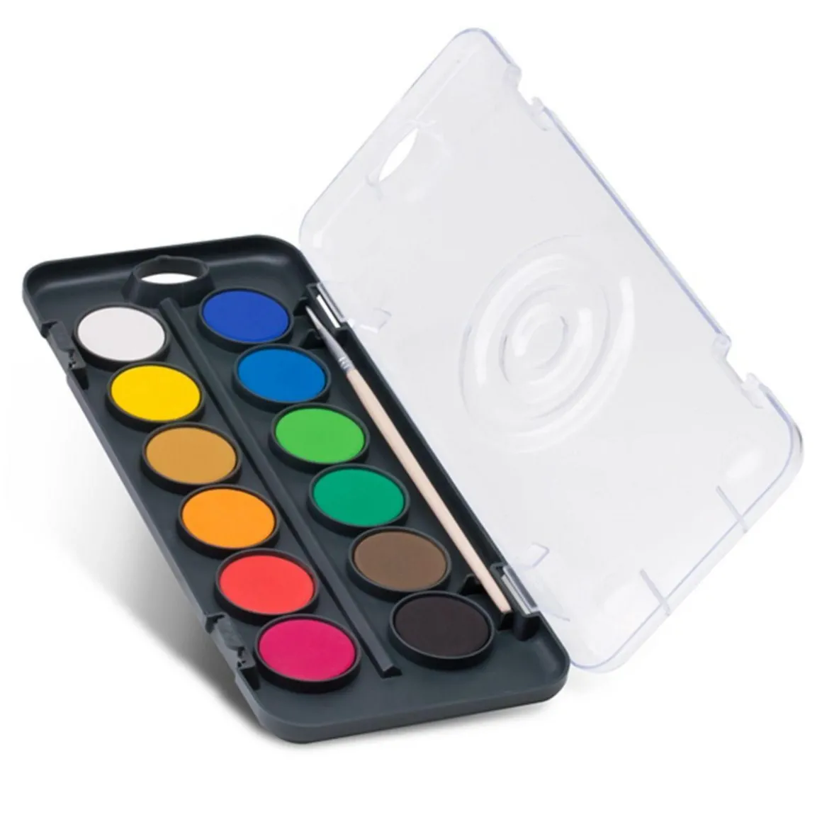 Réalisez de véritables oeuvres d’art avec cette palette d’aquarelle ! Contenu : 12 couleurs de 30 mm de diamètre, une boîte en plastique avec couvercle servant de palette de mélange et 1 pinceau. Ces pastilles de couleurs sont fabriquées en pressant ensemble des poudres hautement pigmentées de qualité fine. Utilisées avec de petites quantités d’eau, les effets sont brillants et opaques. En ajoutant un peu de blanc, on obtient de délicats dégradés pastel. Elle convient aux techniques altiques sur papier et carton ou sur différents matériaux pour des techniques spécifiques. Il peut être utilisé avec toute la gamme de produits à l’eau Morocolor. Bien laver la palette avec de l’eau et du savon après utilisation. Retournez le couvercle et utilisez-le pour mélanger les couleurs ! Dimensions : 25 x 10 x 2 cm.