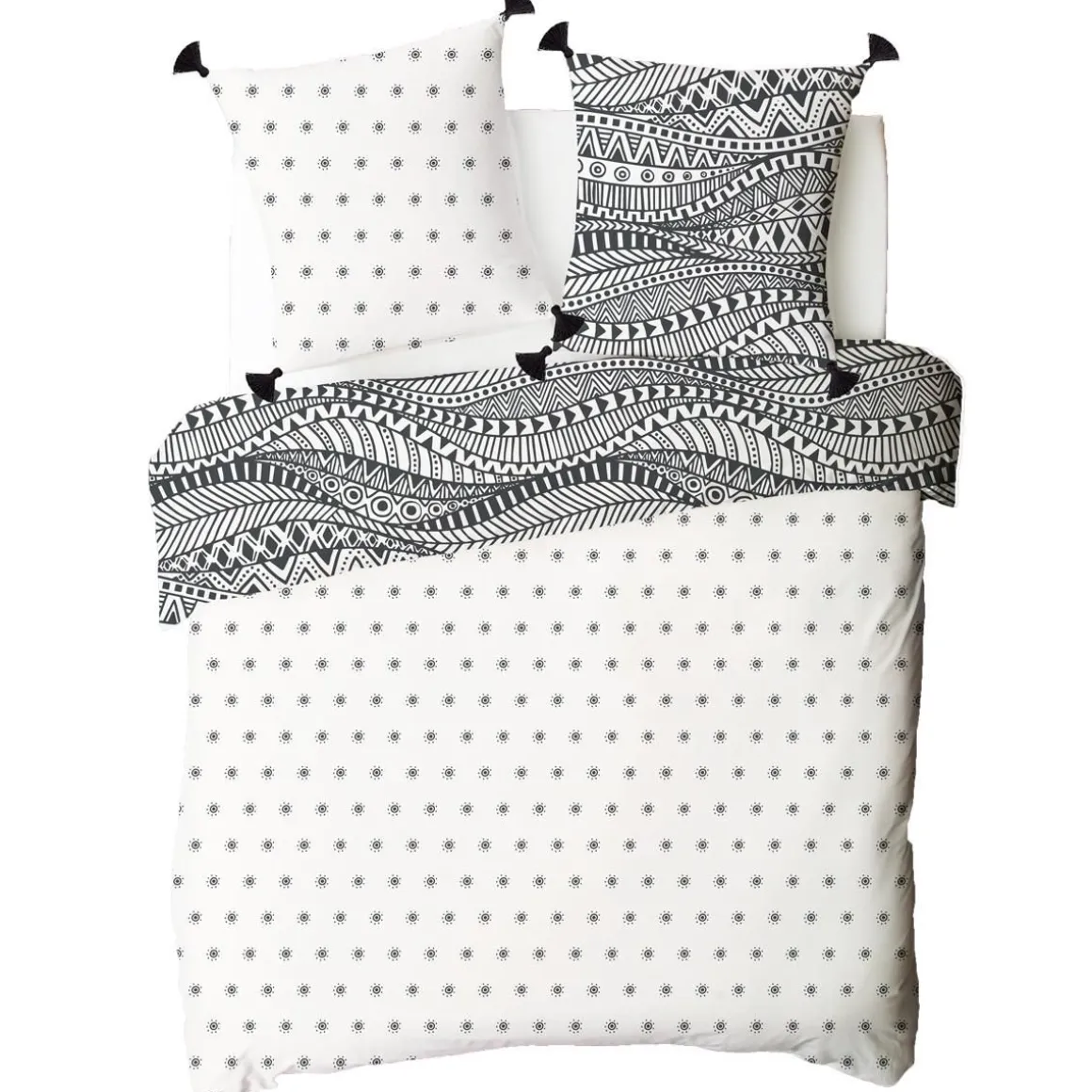Parure de lit en coton réversible imprimé éthnique 57 fils blanc et noir comprenant 1 housse de couette + 2 taies d’oreiller 63x63cm.