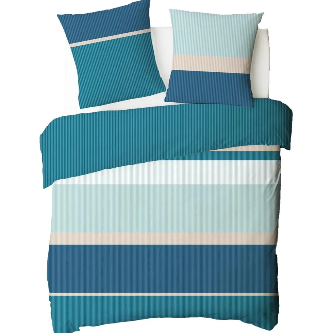 Parure de lit en coton réversible imprimé rayé 57 fils bleu comprenant 1 housse de couette + 2 taies d’oreiller 63x63cm.