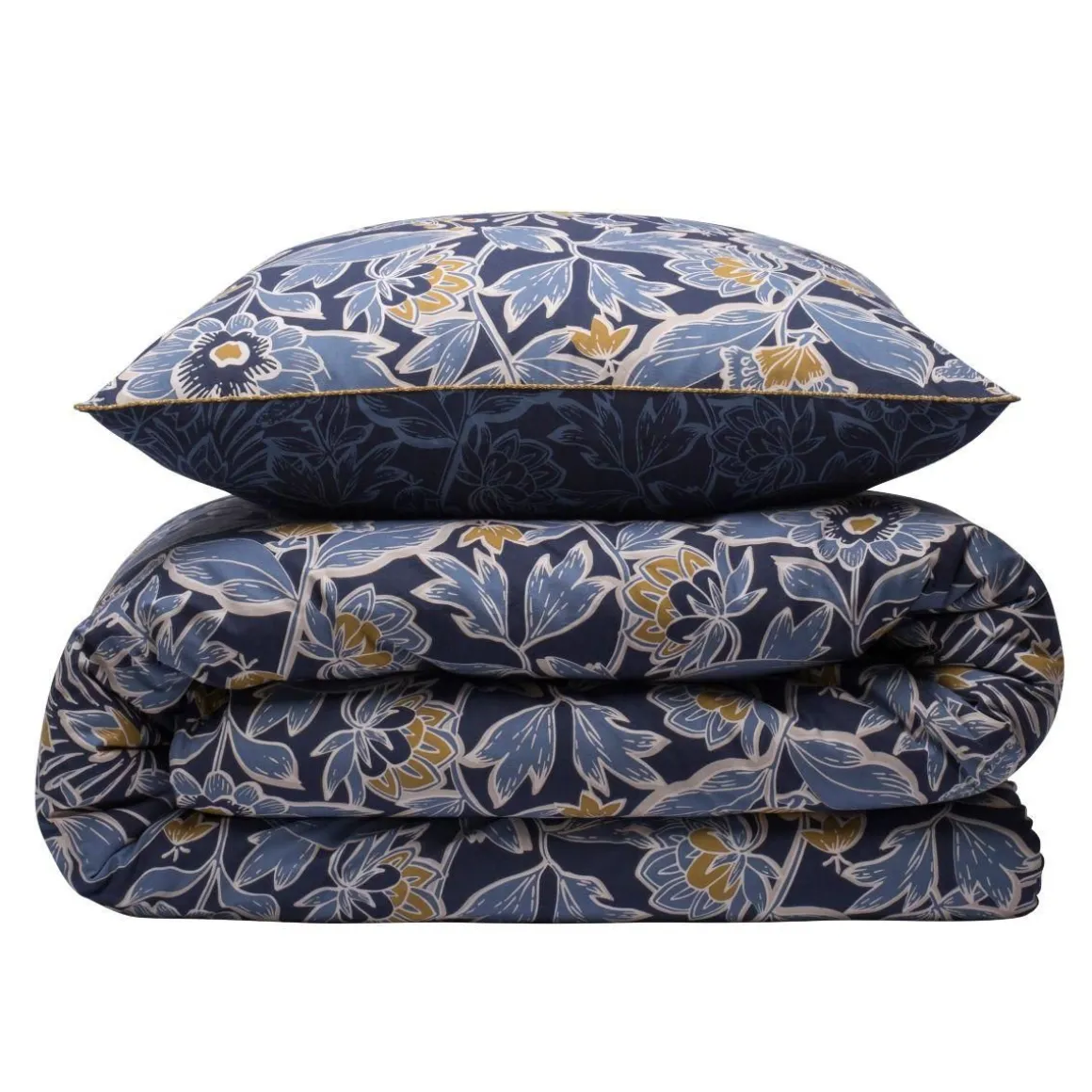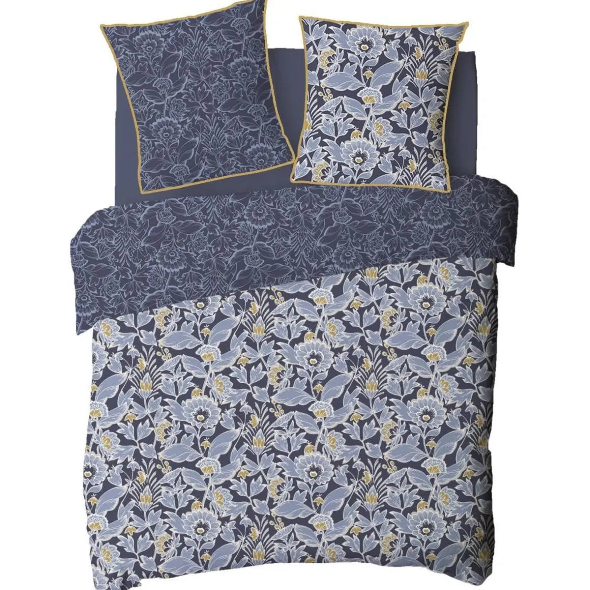 Parure de lit en coton réversible imprimé floral 57 fils bleu comprenant 1 housse de couette + 2 taies d’oreiller 63x63cm.