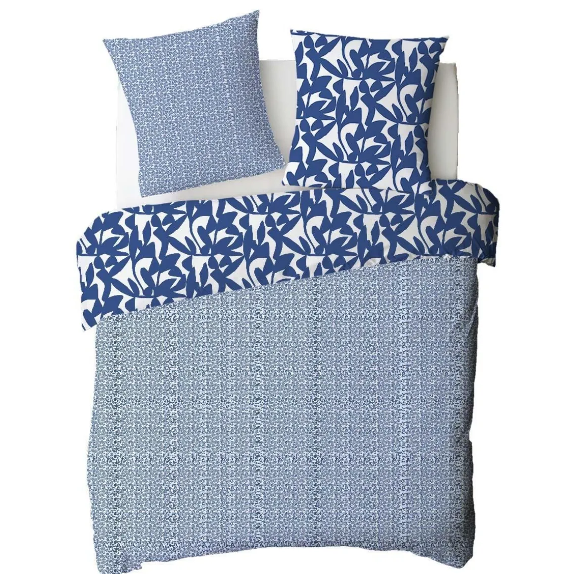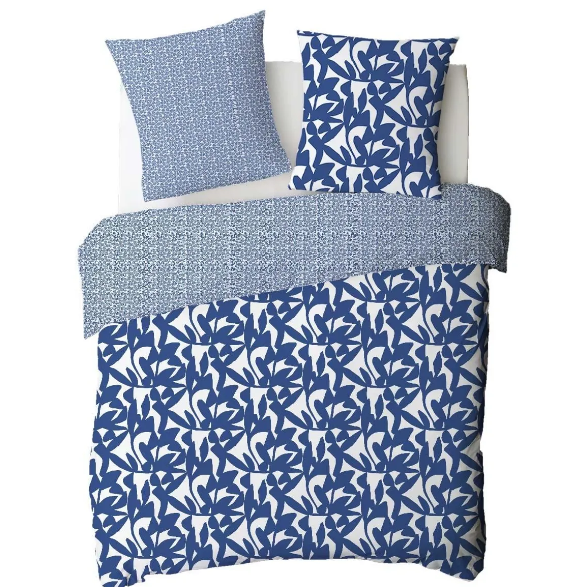 Parure de lit en coton réversible imprimé géométrique 57 fils bleu et blanc comprenant 1 housse de couette + 2 taies d’oreiller 63x63cm.