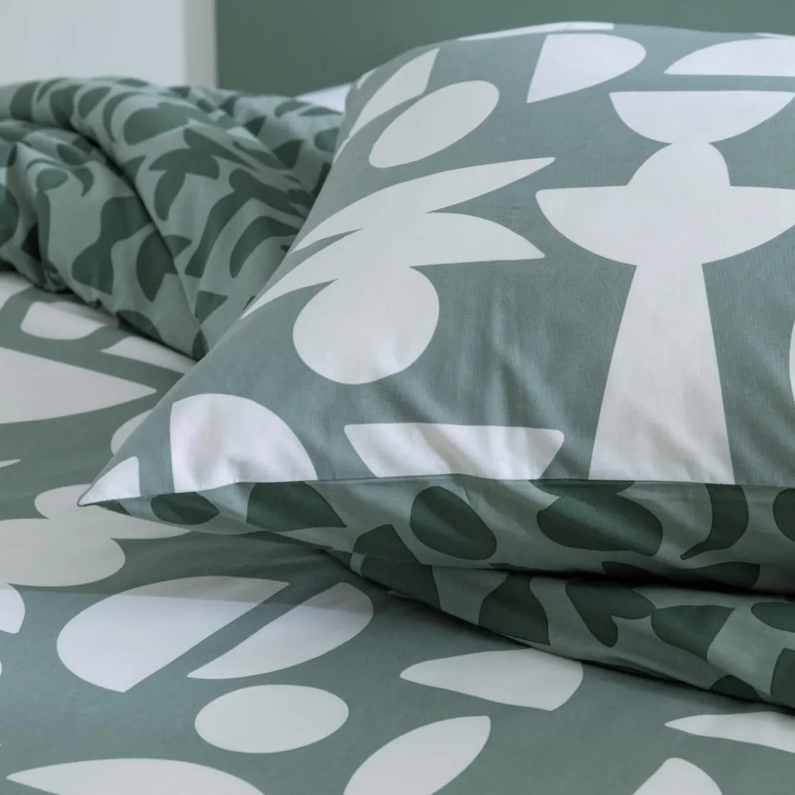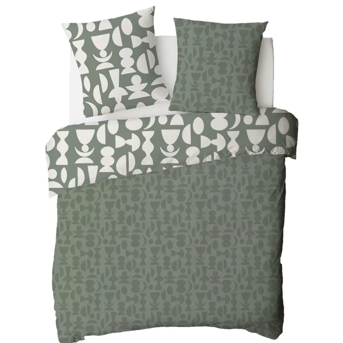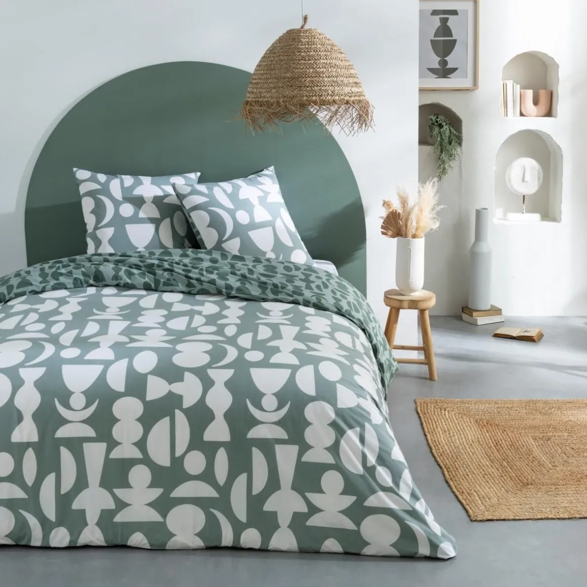 Parure de lit en coton réversible imprimé géométrique 57 fils vert comprenant 1 housse de couette + 2 taies d’oreiller 63x63cm.