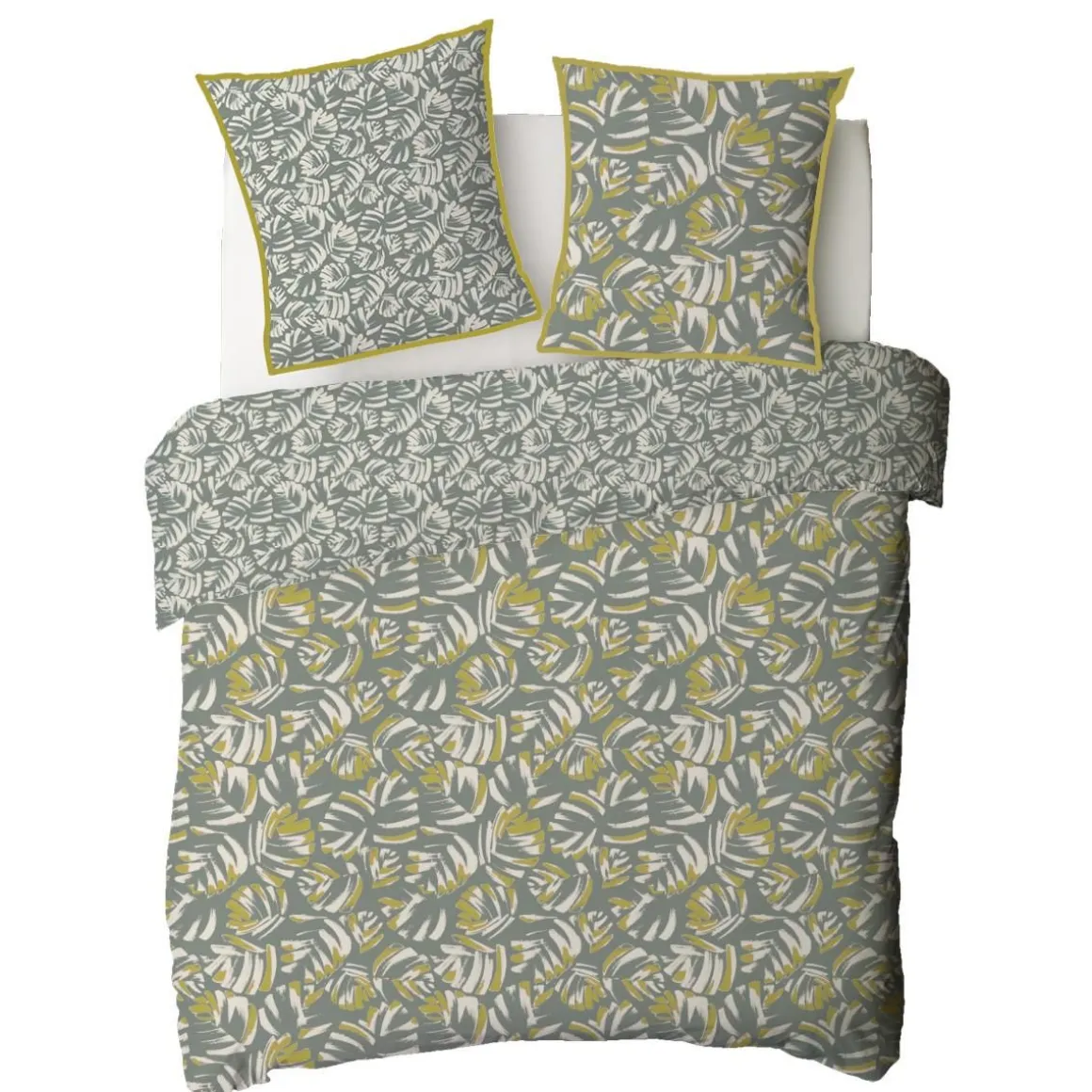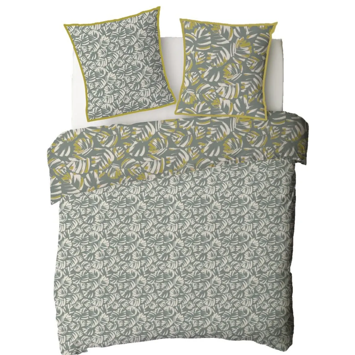 Parure de lit en coton réversible imprimé tropical 57 fils vert comprenant 1 housse de couette + 2 taies d’oreiller 63x63cm.