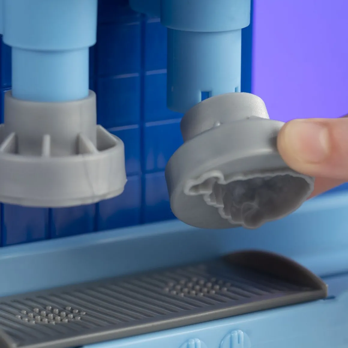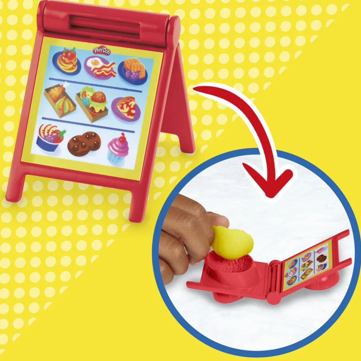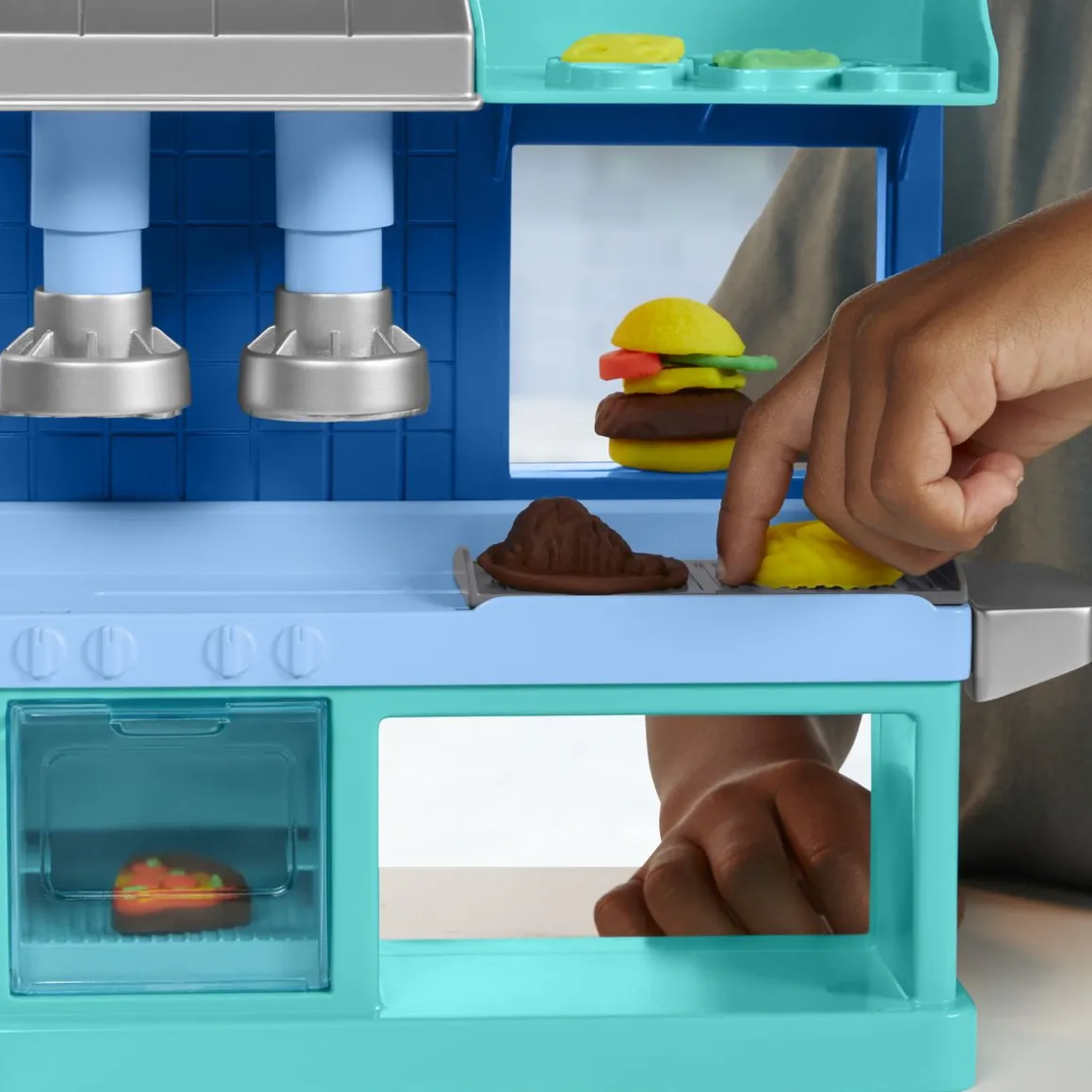 Le coffret Le p’tit resto permet aux enfants de s’amuser à gérer leur propre restaurant alors qu’ils créent, personnalisent et servent des créations alimentaires Play-Doh incroyables à leurs clients factices ! Les enfants peuvent facilement attacher les tampons pour créer des pizzas, des hamburgers, des pâtes ou du poulet factices, puis appuyer sur le levier pour tamponner 2 aliments imaginaires à la fois. Ils regardent ensuite la planche de cuisson glisser vers la station de préparation à mesure qu’ils relâchent le levier ! On peut créer des garnitures factices pour hamburgers, des frites fantastiques, des cookies rigolos et d’autres aliments imaginaires avec les demi-moules se trouvant des deux côtés du coffret de cuisine. On met les créations dans une assiette que l’on sert ensuite par la fenêtre de service pour indiquer à ses amis que la commande est prête ! Le mini panneau du menu et d’autres accessoires de cuisine rehaussent le jeu imaginatif. Ces jouets pour filles et garçons (à partir de 3 ans) sont de super cadeaux pour les enfants qui adorent jouer avec des aliments factices.