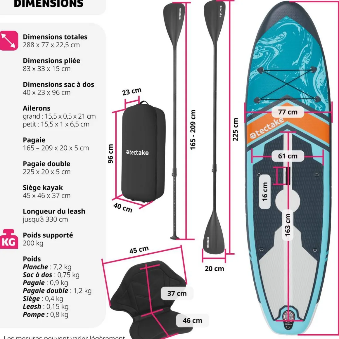 - Pagaie (LxlxH) : env. 165 – 209 x 20 x 5 cm
