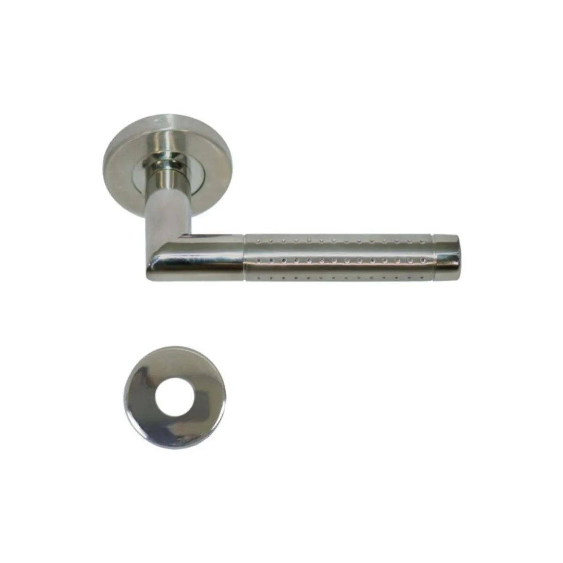 Poignées modèle Barsac avec rosaces rondes batteuses diamètre 20 – inox 304 bicolore brillant mat x2, ces poignées à la fois brillantes et mat s’adapteront parfaitement à votre intérieur. Décorées de poinçons, elles ajouteront une touche moderne à vos portes. Elles sont accompagnées de deux rosaces batteuses inox brillantes.
