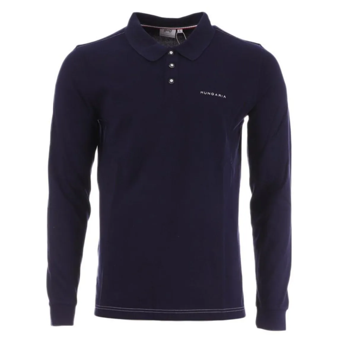 Craquez pour ce polo homme de la marque HUNGARIA à prix bas ! Coloris : Marine Manches longues Col 3 boutons Inscription Hungaria sur la poitrine Composition : 100% Coton