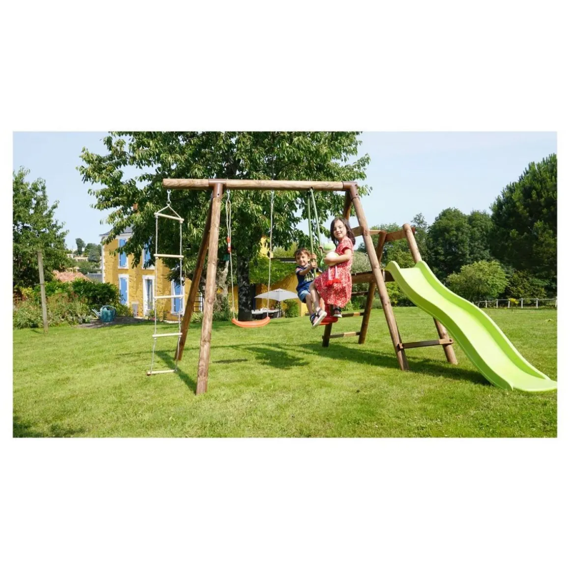 Une station en bois pour s’amuser en toute sécurité ! La station en bois Mûrier est composée d&rsquo,une balançoire, d’un vis-à -vis, d’une échelle corde ainsi que d’une plateforme avec toboggan d’une hauteur de 90 cm. La poutre a un diamètre de 10 cm, et les poteaux un diamètre de 8 cm. Fabriquée en bois traité alte IV contre les Champignons, sa structure est garantie 5 ans. Avec ses deux balançoires, cette station est idéale pour s’amuser entre amis !