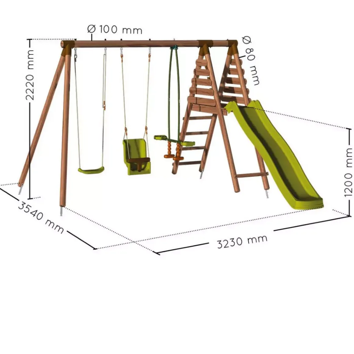 Une station en bois alliant détente, amusement et sécurité ! La station en bois Tulipe est équipée d’un vis-à -vis, d’un siège bébé, d’une balançoire et d’une plateforme avec toboggan d’une hauteur de 120 cm. Les diamètres de la poutre et des poteaux sont respectivement de 10 cm et 8 cm. Faite en bois traité alte IV contre les Champignons, la structure est garantie 5 ans. Cette station est équipée d’un siège bébé pour que les tout-petits puissent aussi en profiter !