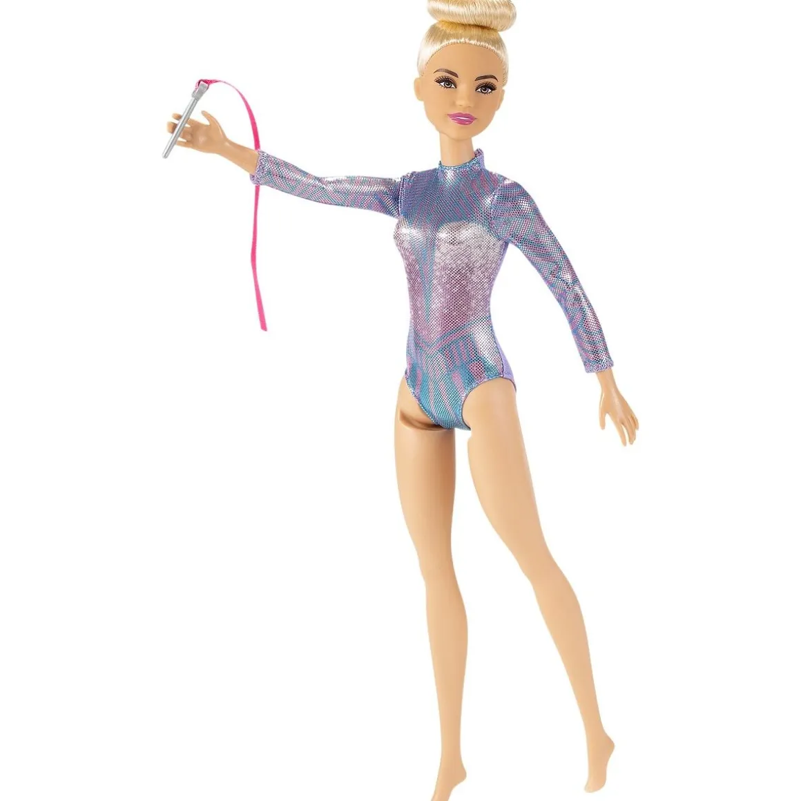 Avec son justaucorps de couleur métallisée et son joli chignon haut, cette Barbie gymnaste (30,4 cm) est prête à exécuter sa chorégraphie !