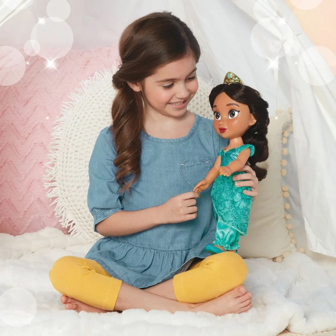 Cette poupée Disney Princesses de 38 cm à l’effigie de la princesse Jasmine a des yeux avec des paillettes intégrées, une tenue à motif avec paillettes et détachable par scratch sur le dos ainsi qu’une paire de chaussures souples pouvant être enlevées.