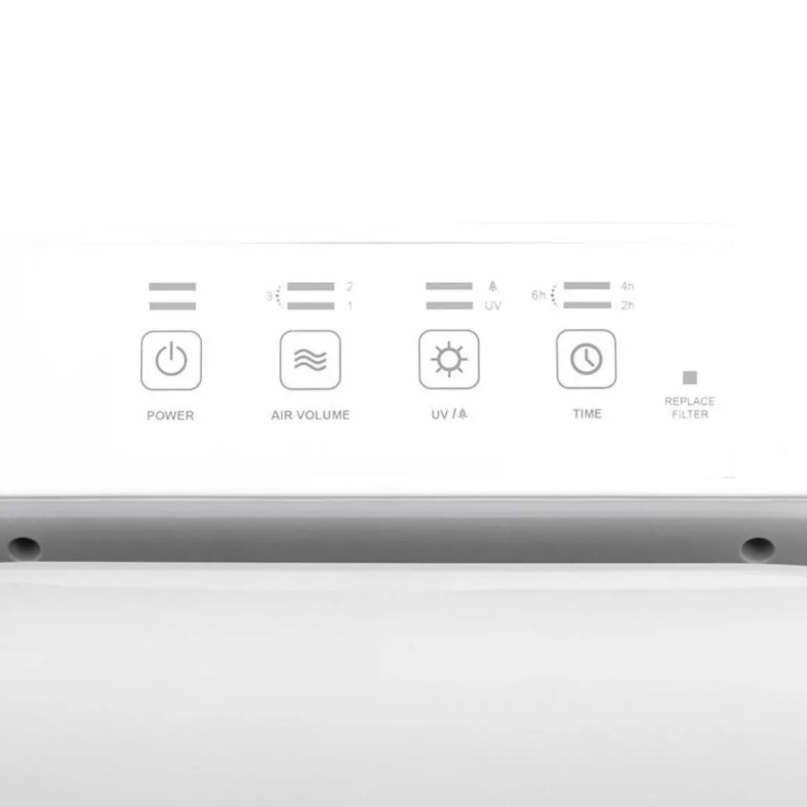 Les commandes s’effectuent à travers un panneau de commande tactile ultra simple à 3 touches. De petites LEDs bleu indiquent ce faisant quel est le réglage en cours et si il est temps de changer le filtre. Trois niveaux de puissance vous permettent de régler l’appareil eut égard au degré d’impureté de l’air. La minuterie vous permet également de l’activer pendant 2, 4 ou 6 heures avant qu’il ne s’éteigne automatiquement.