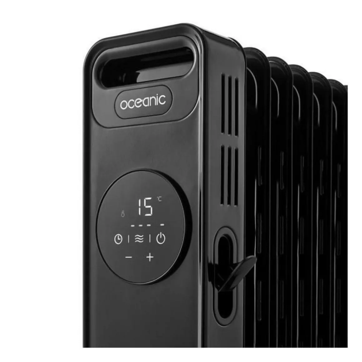 Oceanic Radiateur électrique d’appoint bain d’huile – 9 éléments – 3 puissances de chauffe : 900W – 1100W – 2000W – Thermostat électronique – Ecran a affichage LED – Minuterie jusqu’a 24H – Télécommande – Poignée de transport intégrée – Enrouleur de câble intégré – Témoin lumineux de fonctionnement – Coupure sécurité anti-renversement et anti-surchauffe