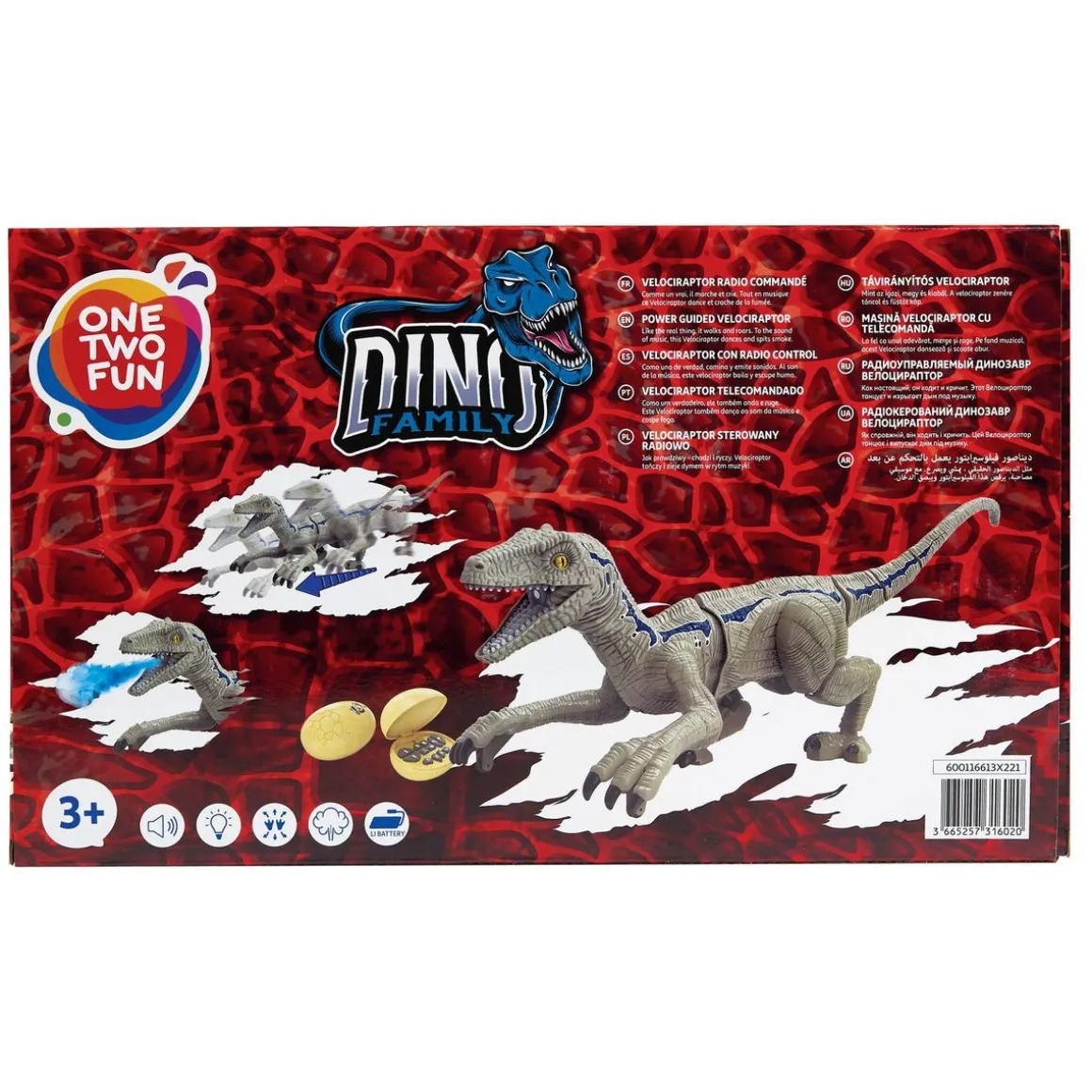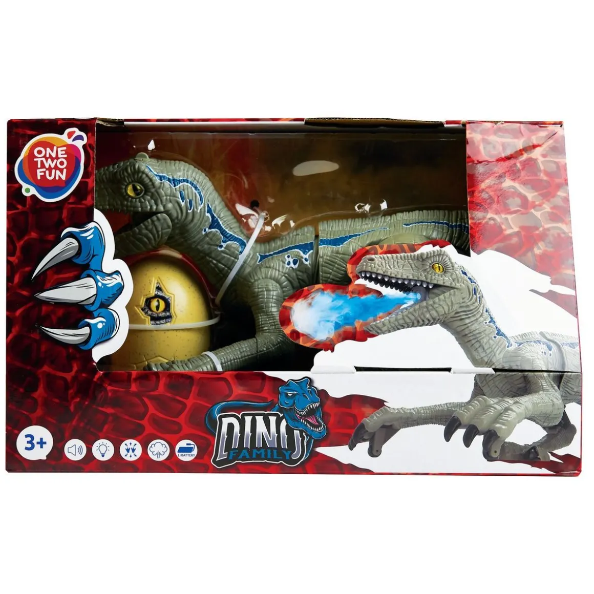 Comme un vrai, il marche et crie. Tout en musique, ce Velociraptor danse et crache de la fumée.