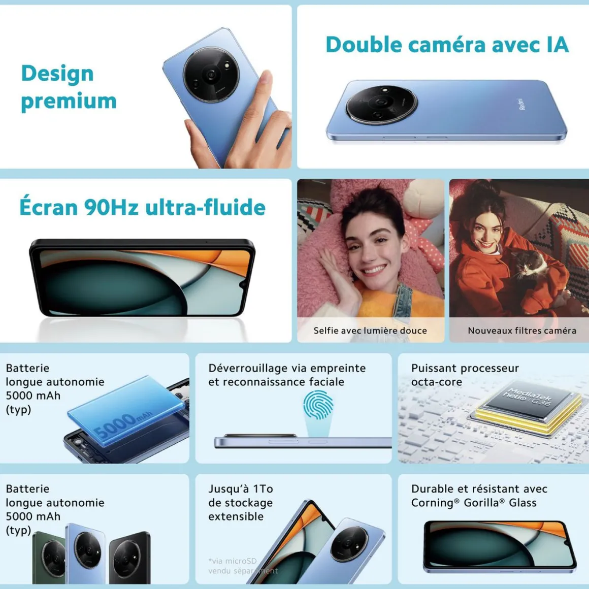 Le Xiaomi Redmi A3 est un smartphone élégant avec une capacité de 64 Go de stockage, propulsé par un processeur MediaTek Helio G36 et 3 Go de RAM. Son écran de 6,71 pouces offre une résolution de 720 x 1650 pixels, parfait pour une utilisation quotidienne. Côté photo, il dispose d’un double capteur arrière de 8 Mpx et d’une caméra frontale de 5 Mpx. Sa batterie de 5000 mAh assure une longue autonomie. Avec Android 14, il combine performance et accessibilité.