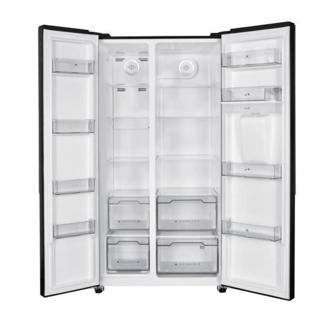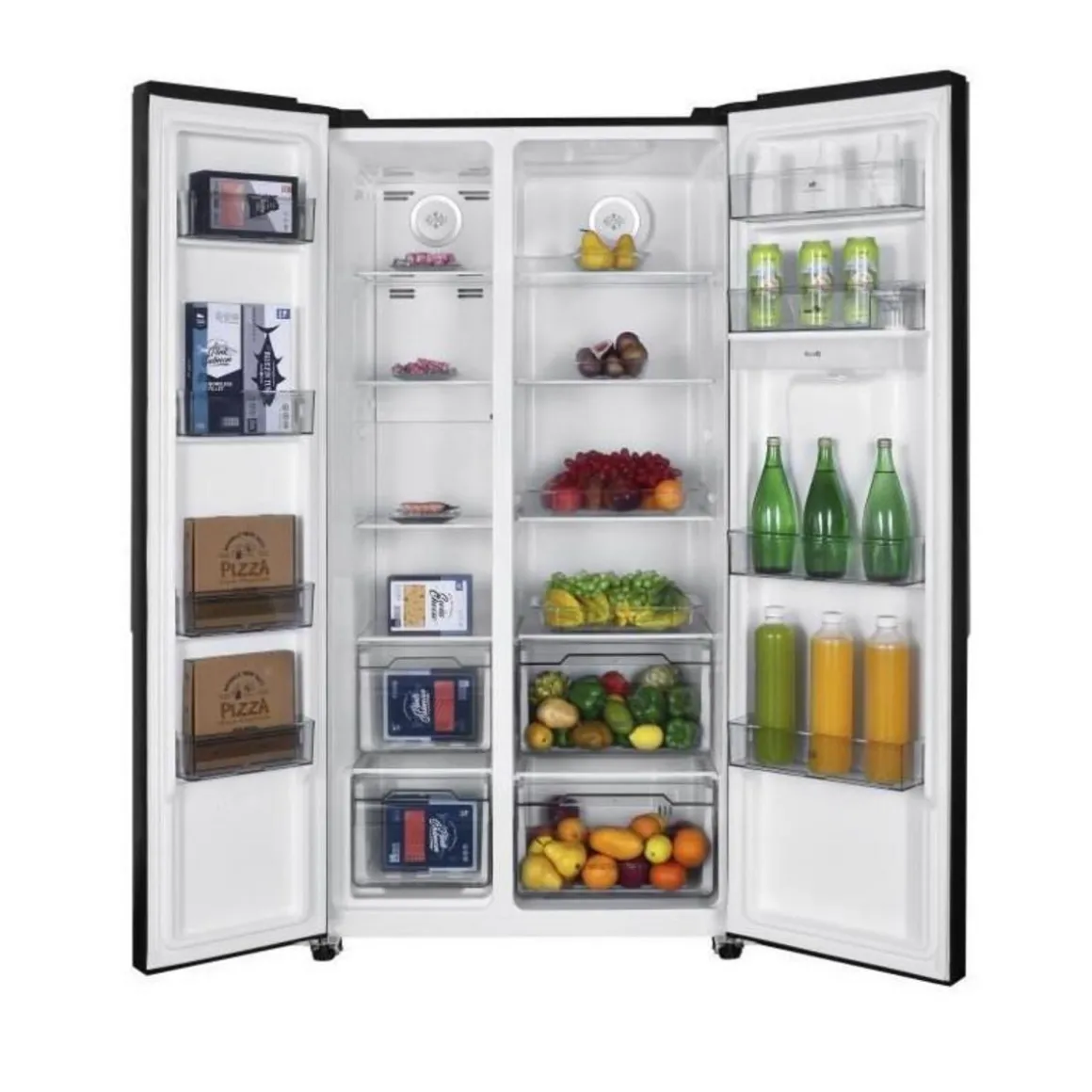 Réfrigérateur américain avec distributeur d’eau – 529L – Total No Frost – moteur inverter – Classe E – 39 dB – température réglable – température min – 25° – max 8°C – alarme porte ouverte – pieds réglables – affichage LCD – L90 x P66 x H177cm – Noir brillant – Garantie 2 ans pieces main d’oeuvre et déplacement