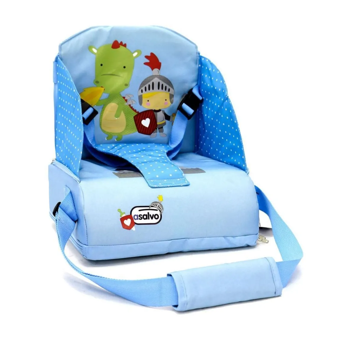 Textile haute densité. Chaise haute à fixer sur une chaise. Poignée de transport. Hauteur dossier 25 cm. Harnais de sécurité. Poche intégrée.