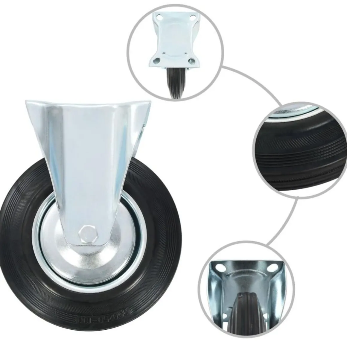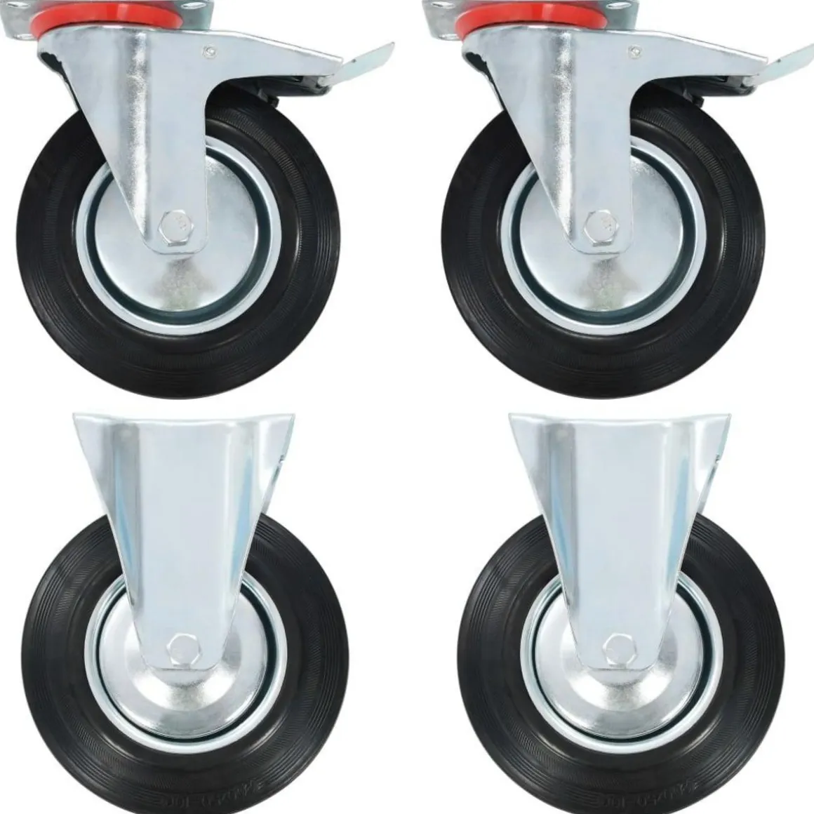 Ces roulettes sont fabriquees en caoutchouc qui se distingue par une bonne resistance aux chocs et aux vibrations, permettant a ces roulettes de fonctionner en douceur et silencieusement. De plus, leurs surfaces douces protegent efficacement votre sol des egratignures. En outre, le cadre en fer zingue est hautement resistant a la rouille et ajoute ainsi a la robustesse et a la durabilite de la roulette pivotante. Deux de ces roulettes pivotantes sont equipees de freins doubles pour controle flexible. Chaque roulette pivotante a une capacite de charge maximale de 180 kg.