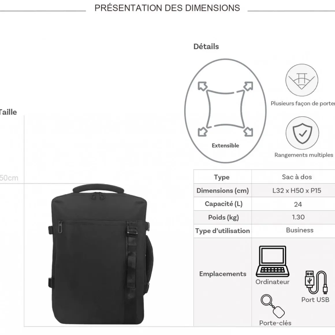 Les dimensions indiquées sont les dimensions extérieures des bagages, comprenant poignées, roulettes, pieds, poches latérales et autres éléments extérieurs.