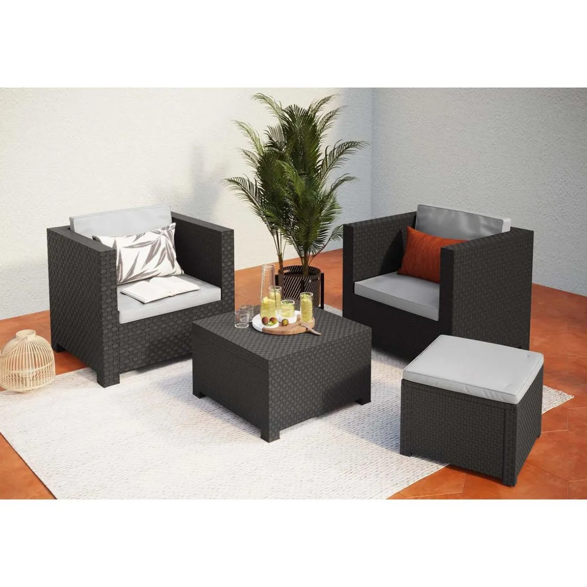 Intemporel et design, ce salon de jardin en resine tressee comprend egalement une table basse et un pouf, ideal pour recevoir vos convives pour des moments chaleureux!