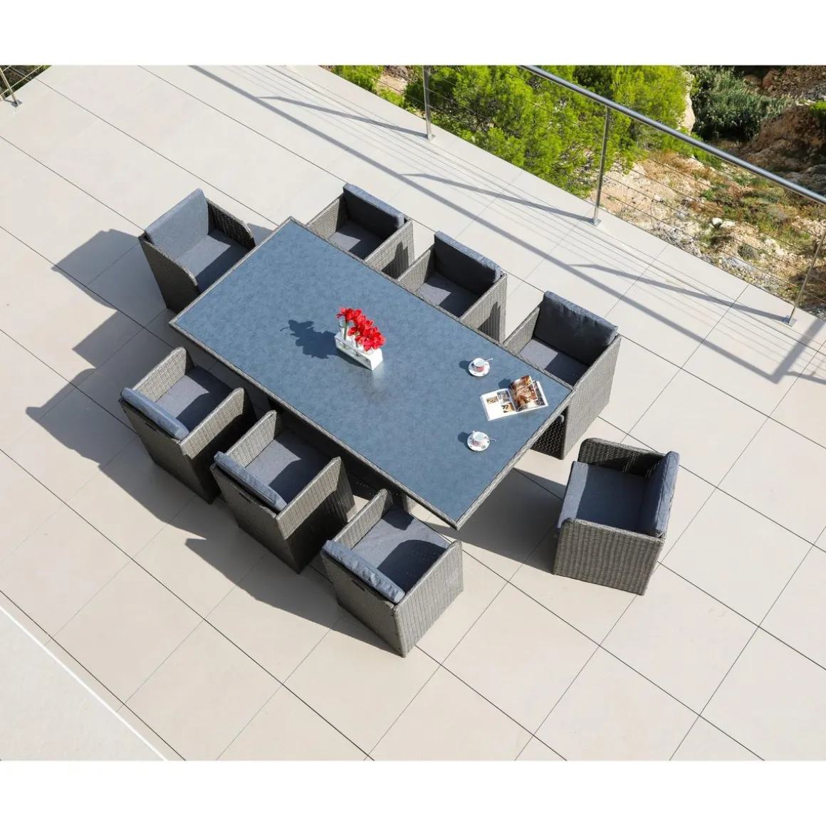 Structure acier, résine tressée fil plat, plateau en verre effet ton pierre, fauteuils avec coussins au dos, rangement des fauteuils sous la table, coussins d’assises fournis. À monter entièrement.