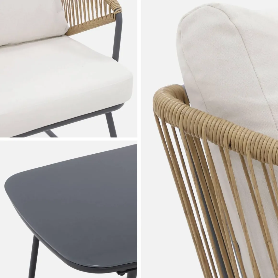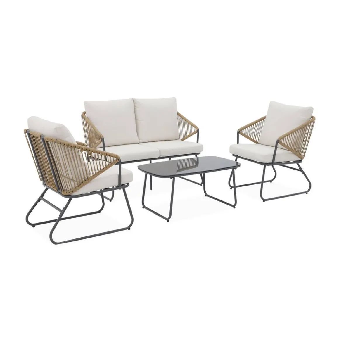 Sa structure en acier galvanisé assure une durabilité exceptionnelle. Sa table basse avec plateau en verre securit de 5mm est solide et résistante. Pour votre confort, les coussins d’assise sont épais de 7cm et les dossiers de 18cm. De plus, ils sont déhoussables pour être nettoyés facilement.