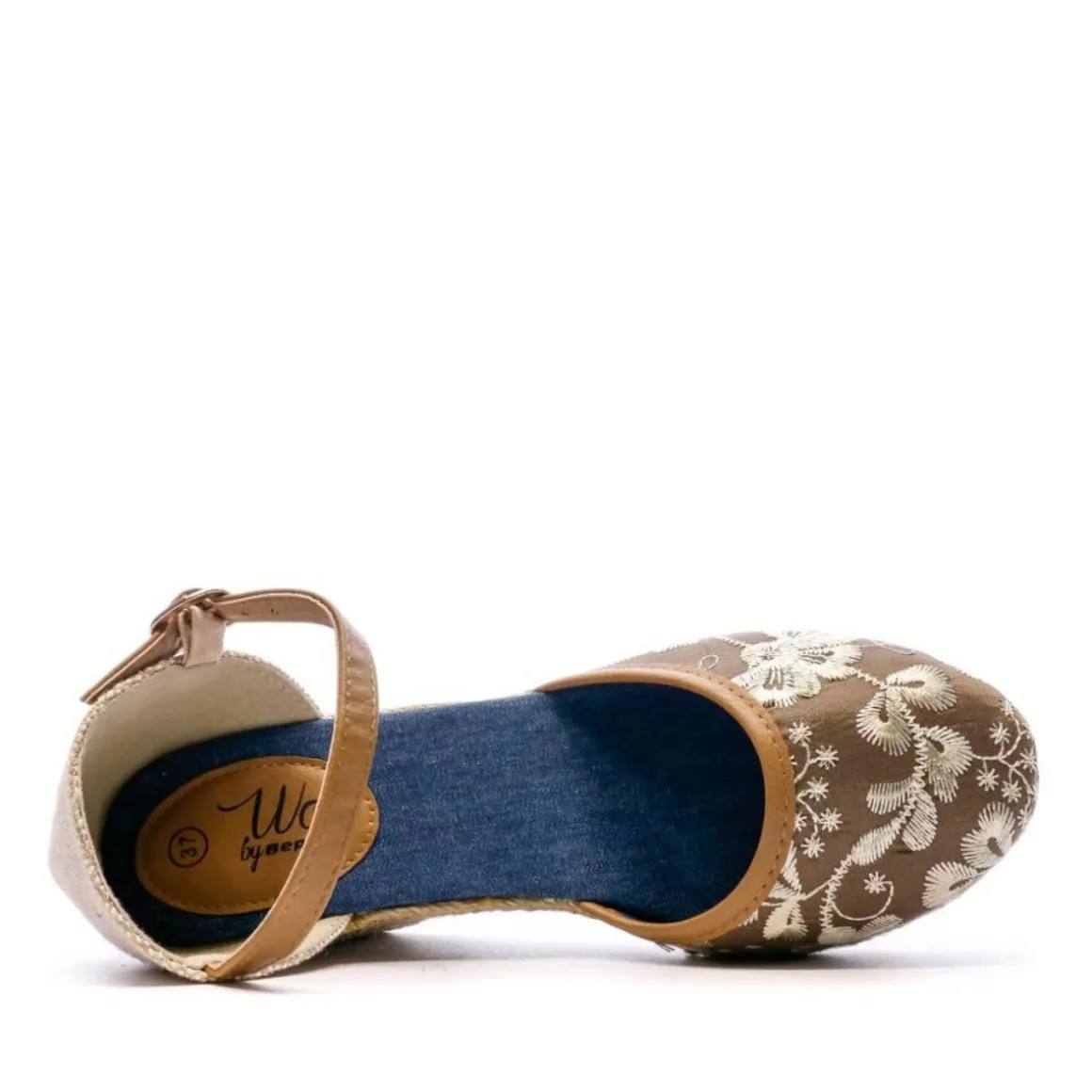 Sandales femme de la marque Beppi ! Tige en textile Talon compensé Coloris : Marron Fleurs brodé Talon recouvert de corde Bride réglable à la cheville Hauteur talon : 9.5cm