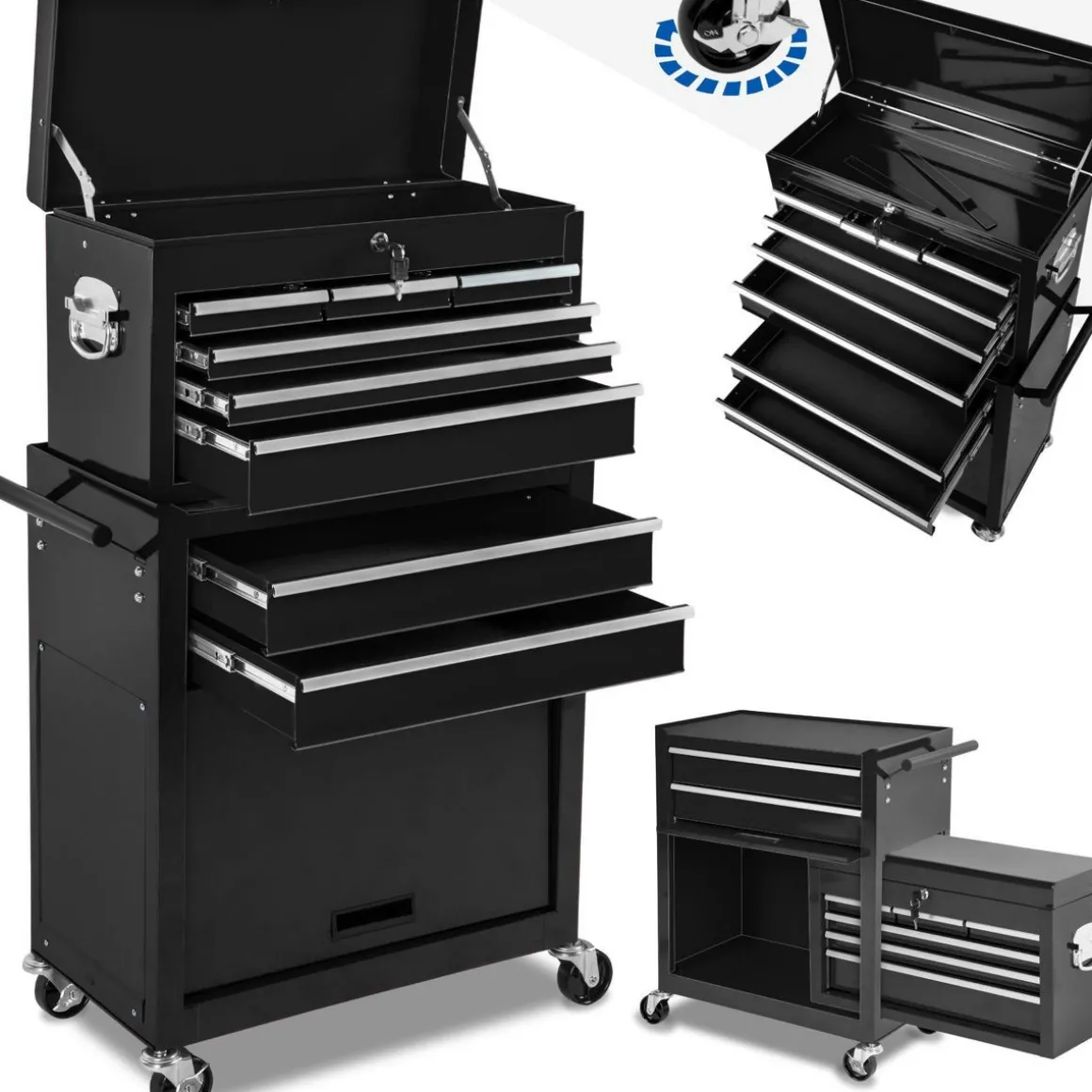 - La servante d’atelier et la caisse à outils sont équipées de coulisses à billes.