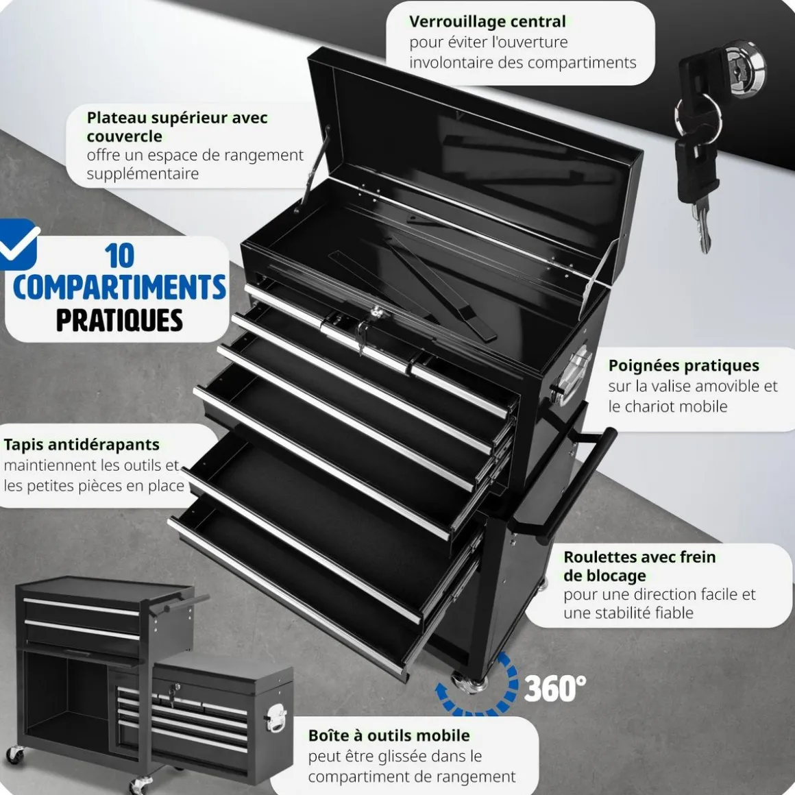- 1 Servante d’atelier avec 1 Caisse à outils amovible et 2 Clés.