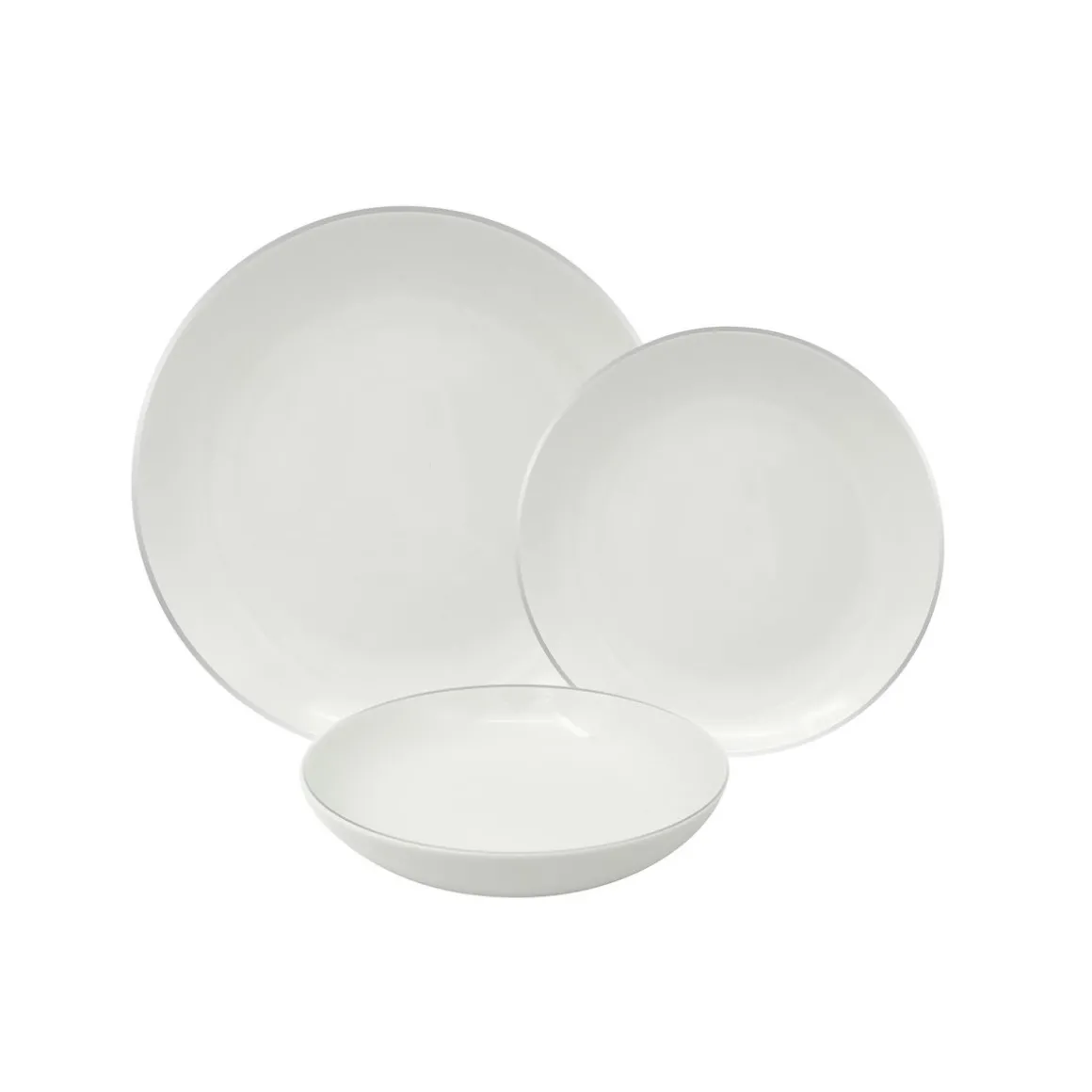 Service de table chic en porcelaine blanche et filet argent composé de 6 assiettes plates, 6 assiettes à dessert et 6 assiettes creuses. Non compatible lave-vaisselle et micro-ondes.