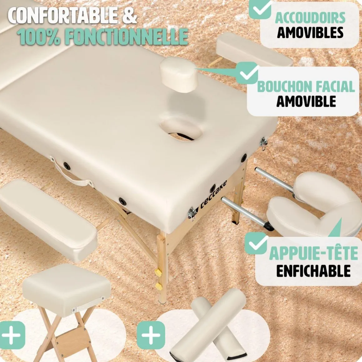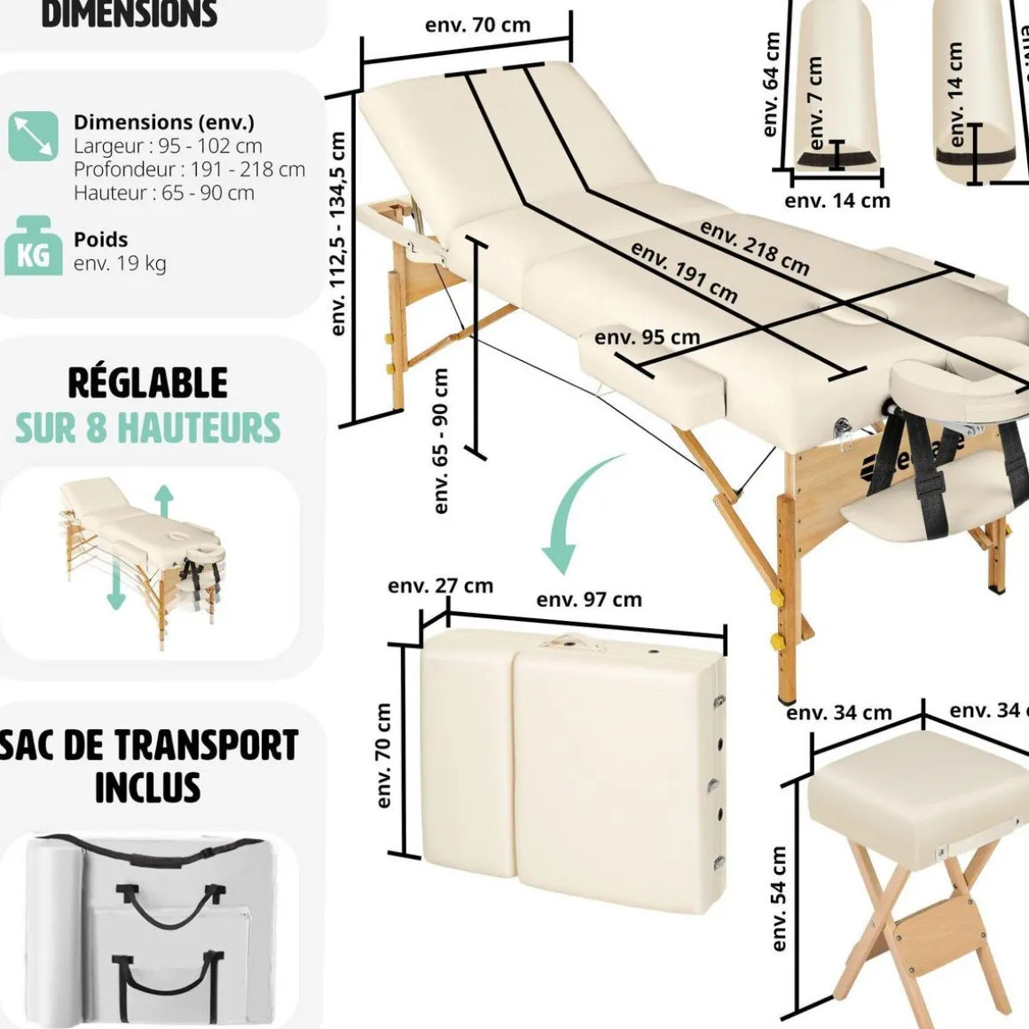 Votre table de massage est livrée avec tous les accessoires essentiels pour une expérience complète. Vous trouverez dans le set des tabourets, des rouleaux de positionnement et un sac de transport pratique. Chaque élément est conçu pour compléter votre table de massage et offrir une expérience de détente ultime.