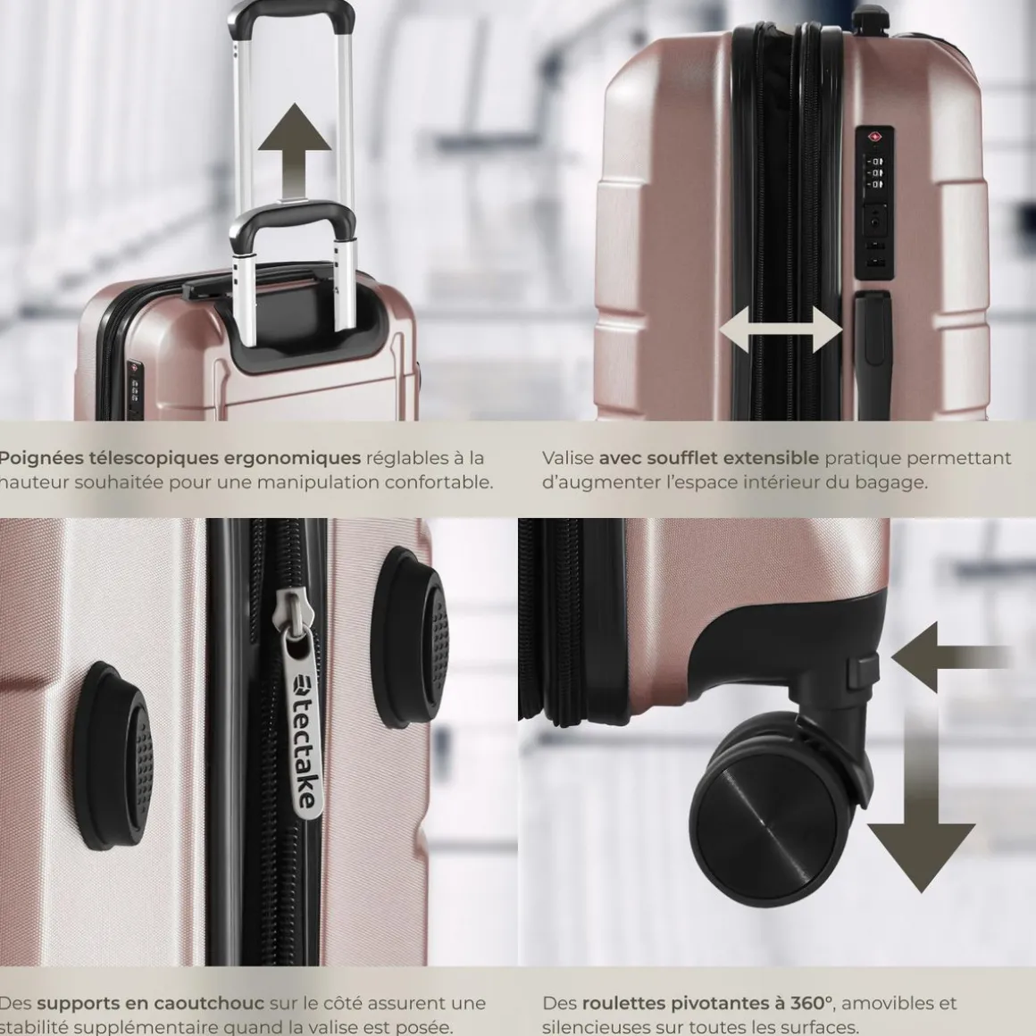 Chacune des valises du set est équipée de roulettes en caoutchouc amovibles et faciles à manier, qui peuvent pivoter à 360° de manière flexible. Elles glissent sans effort sur toutes les surfaces et facilitent considérablement votre transport – que ce soit sur à l’aéroport ou sur le chemin de l’hôtel. S’ajoutent à cela les poignées en caoutchouc ainsi que la poignée télescopique réglable en trois positions et de forme ergonomique qui vous offrent un confort maximal et rendent la manipulation des valises agréable. Pour une petite pause en chemin, les valises peuvent être posées confortablement sur les pieds latéraux.